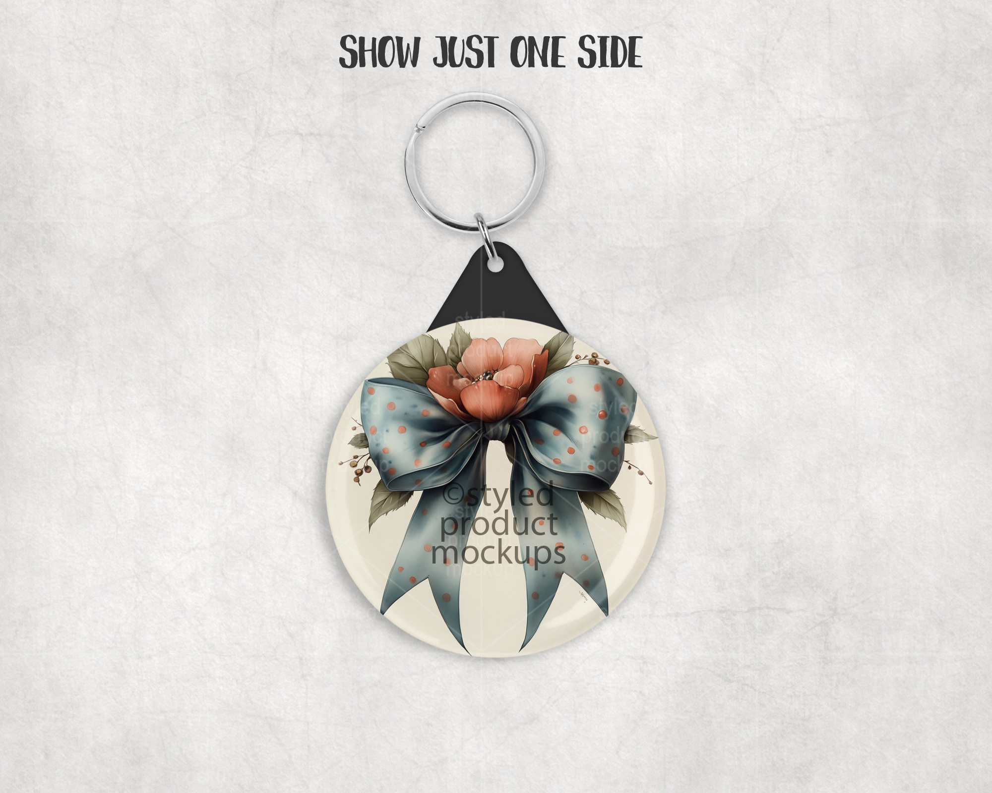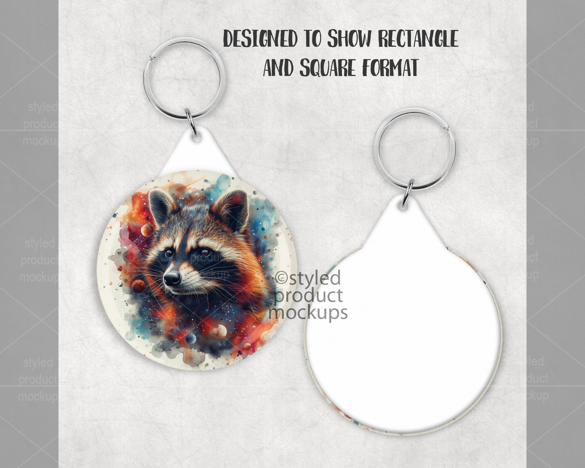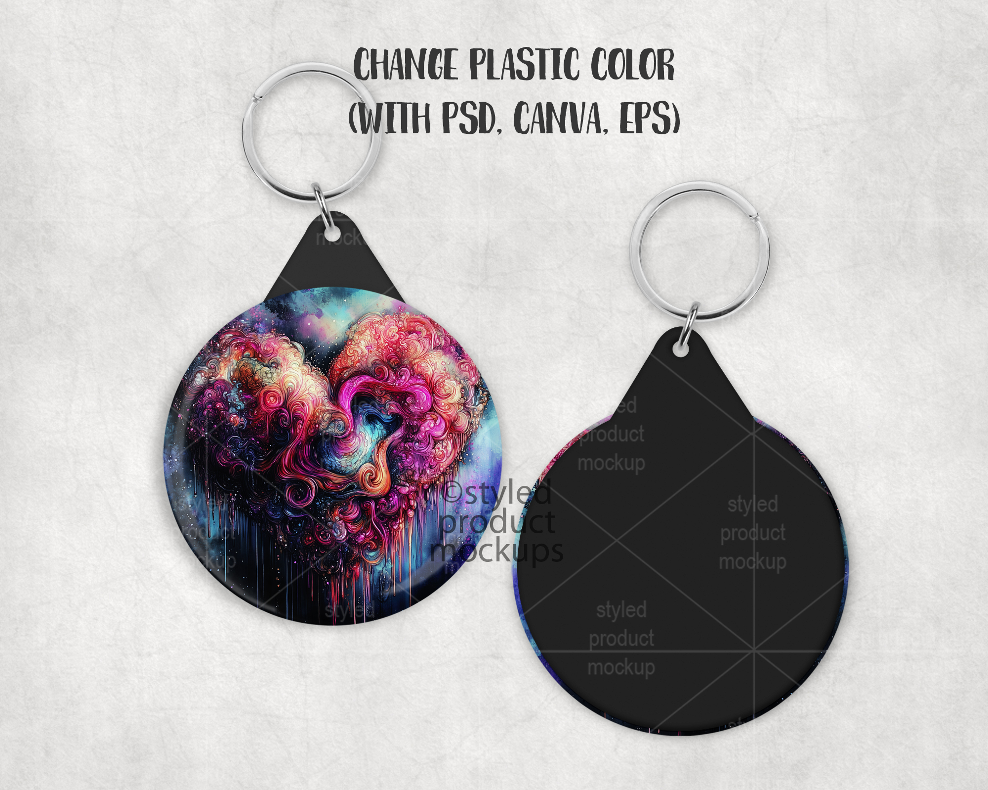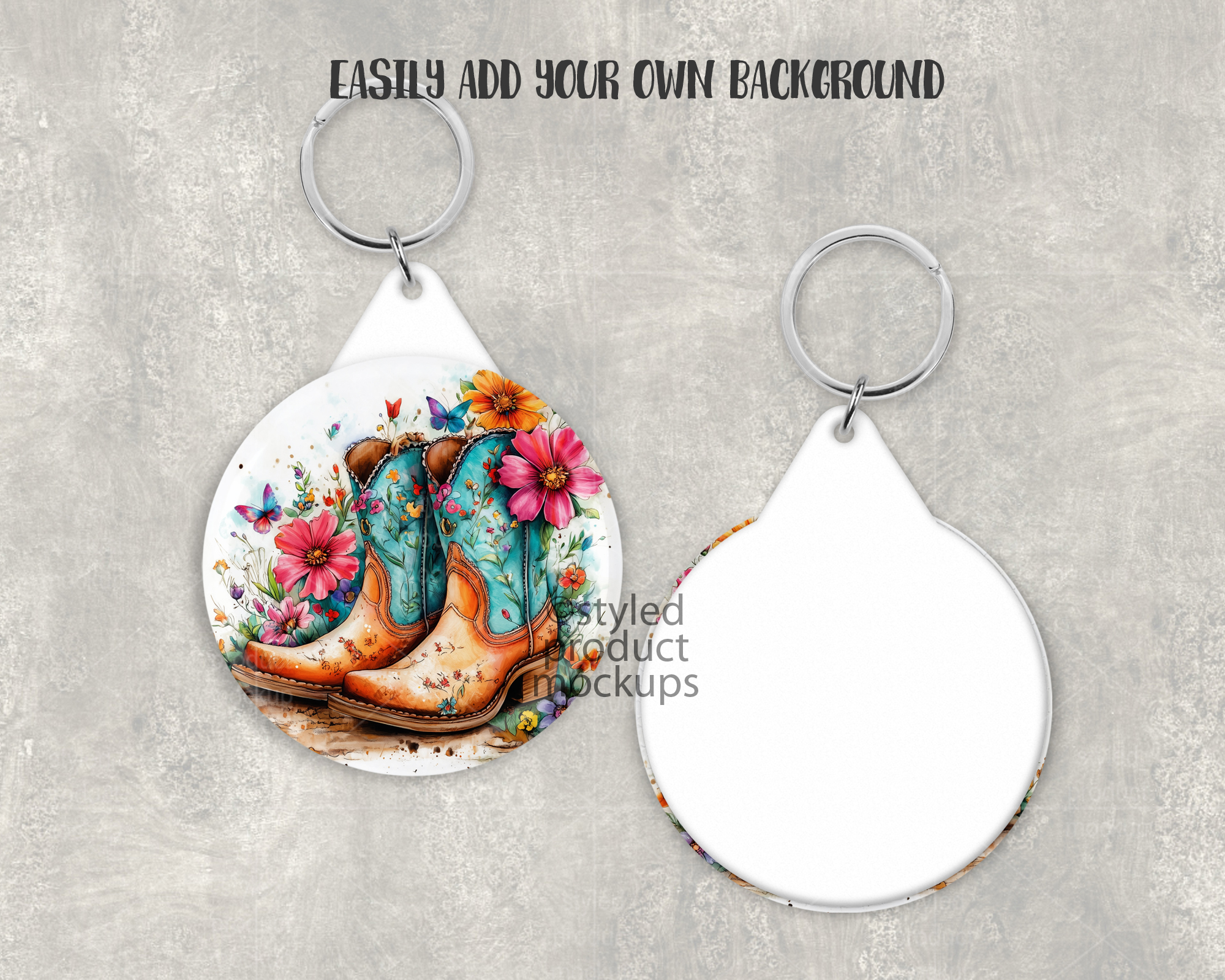 This listing is a mock-up that features the front and back of a plastic back button key ring. Give a professional touch to your button keychain designs without the hassle of photographing each one. Our template is ready to use, simply add in your own art files and background.