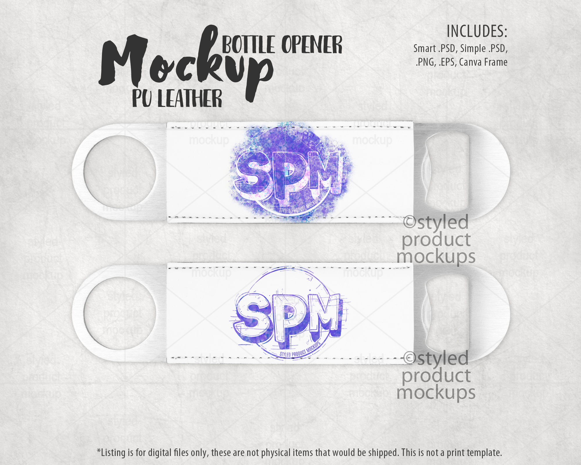 Key Words: bottle opener, bar, leather, poly leather, sublimation, mockup, template, display, PSD, PNG, digital, stock photography