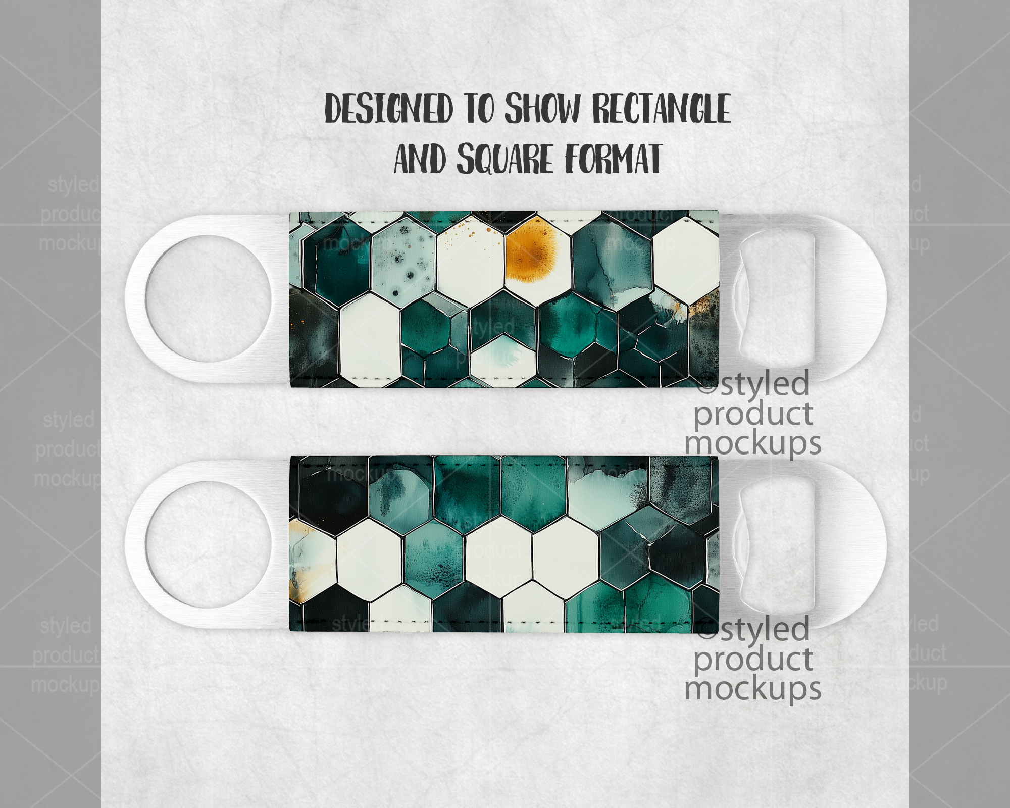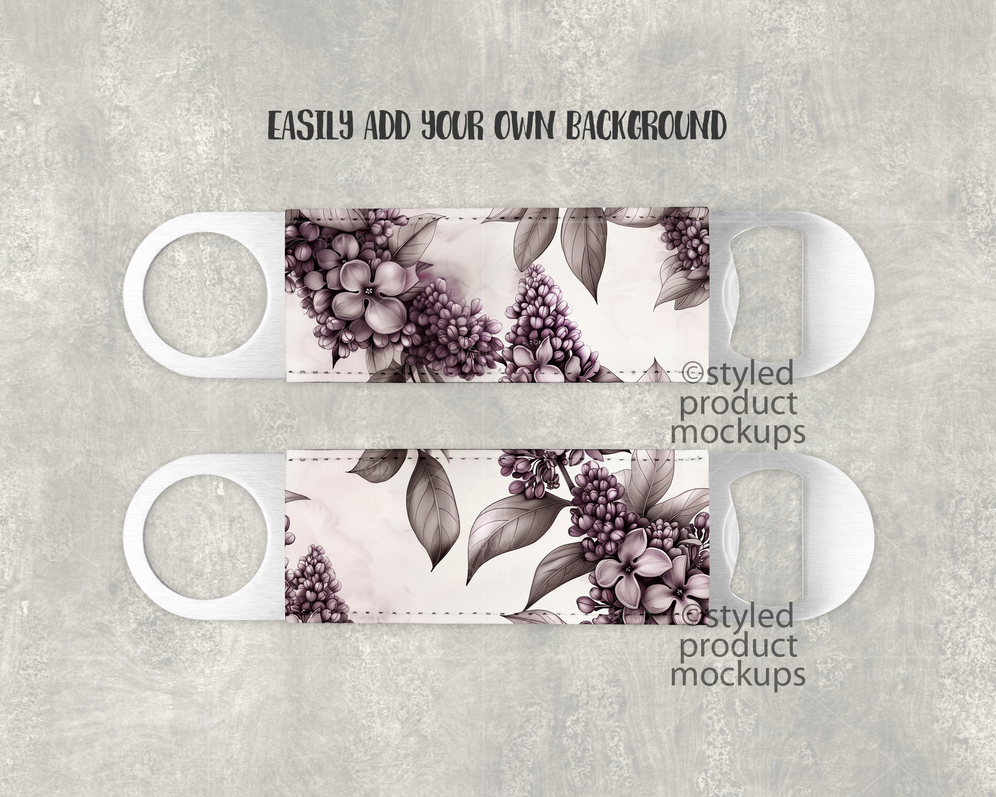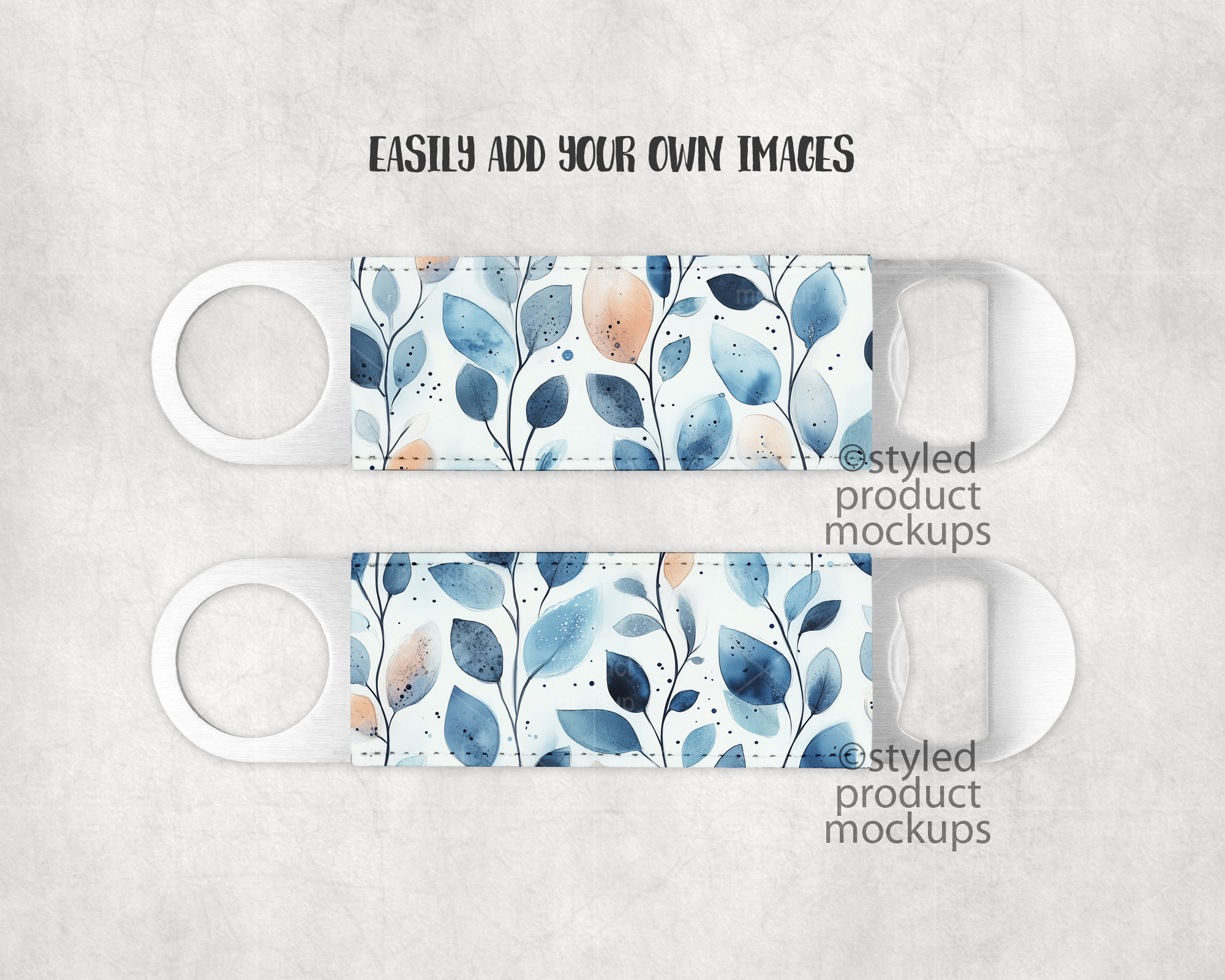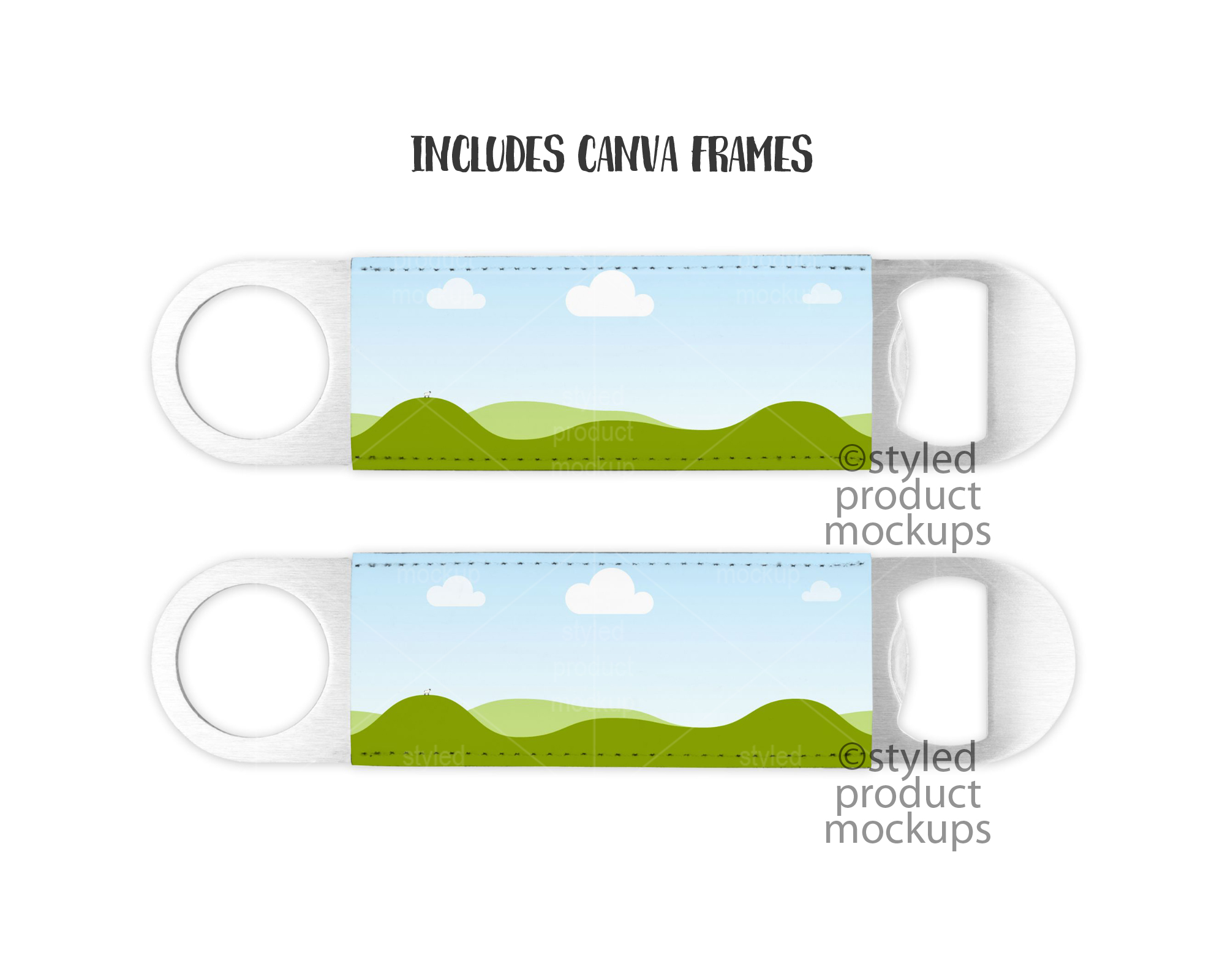 This listing is a mock-up that features the front and back of a dye sublimation poly leather bar bottle opener. Give a professional touch to your bottle opener designs without the hassle of photographing each one. This styled product mockups template is ready to use, simply add in your own art files and background.