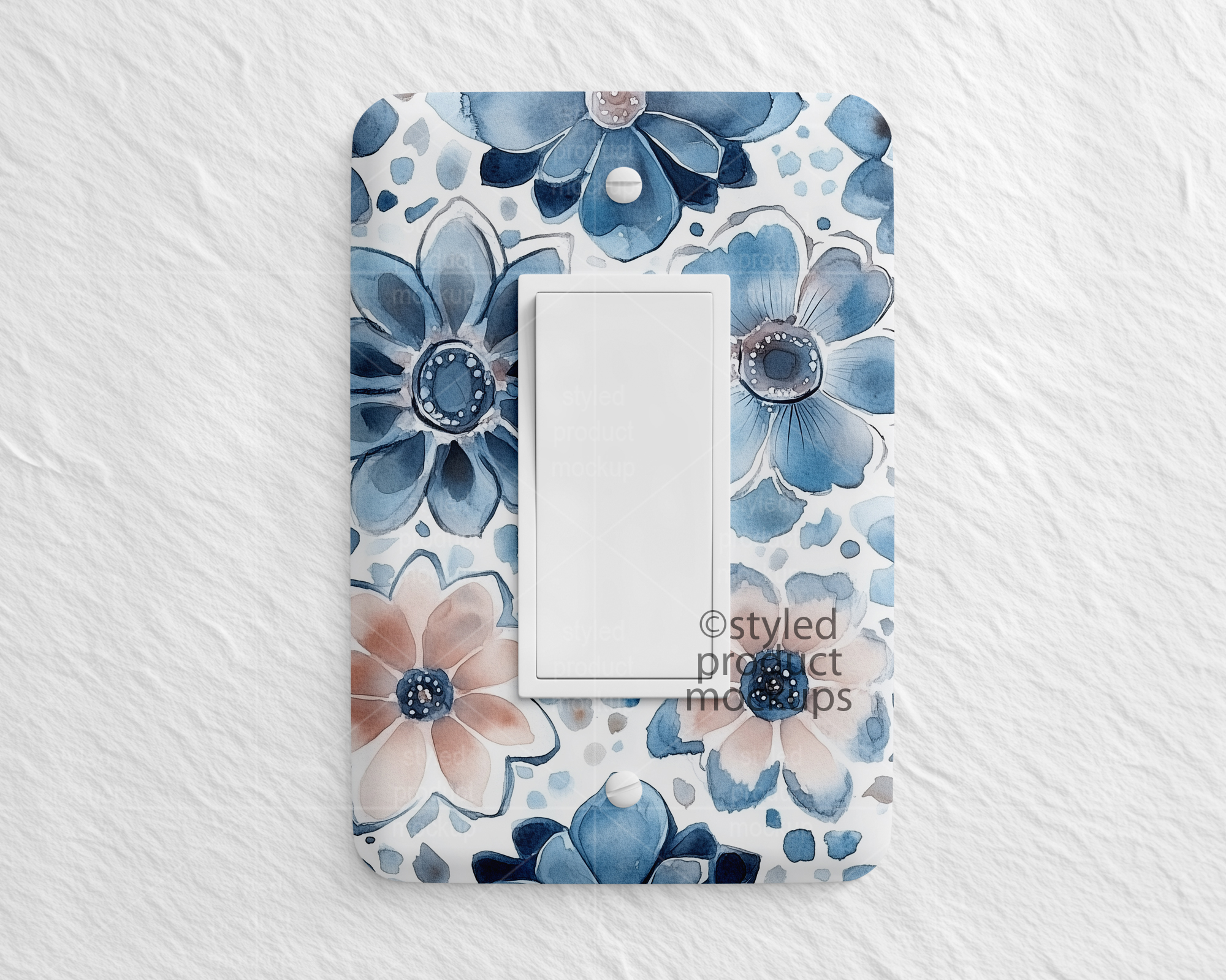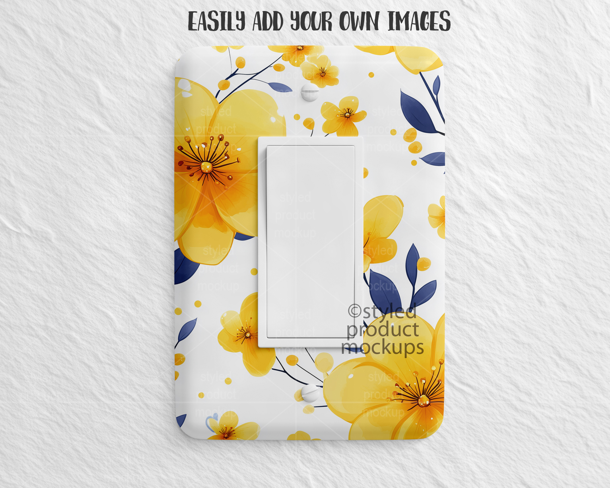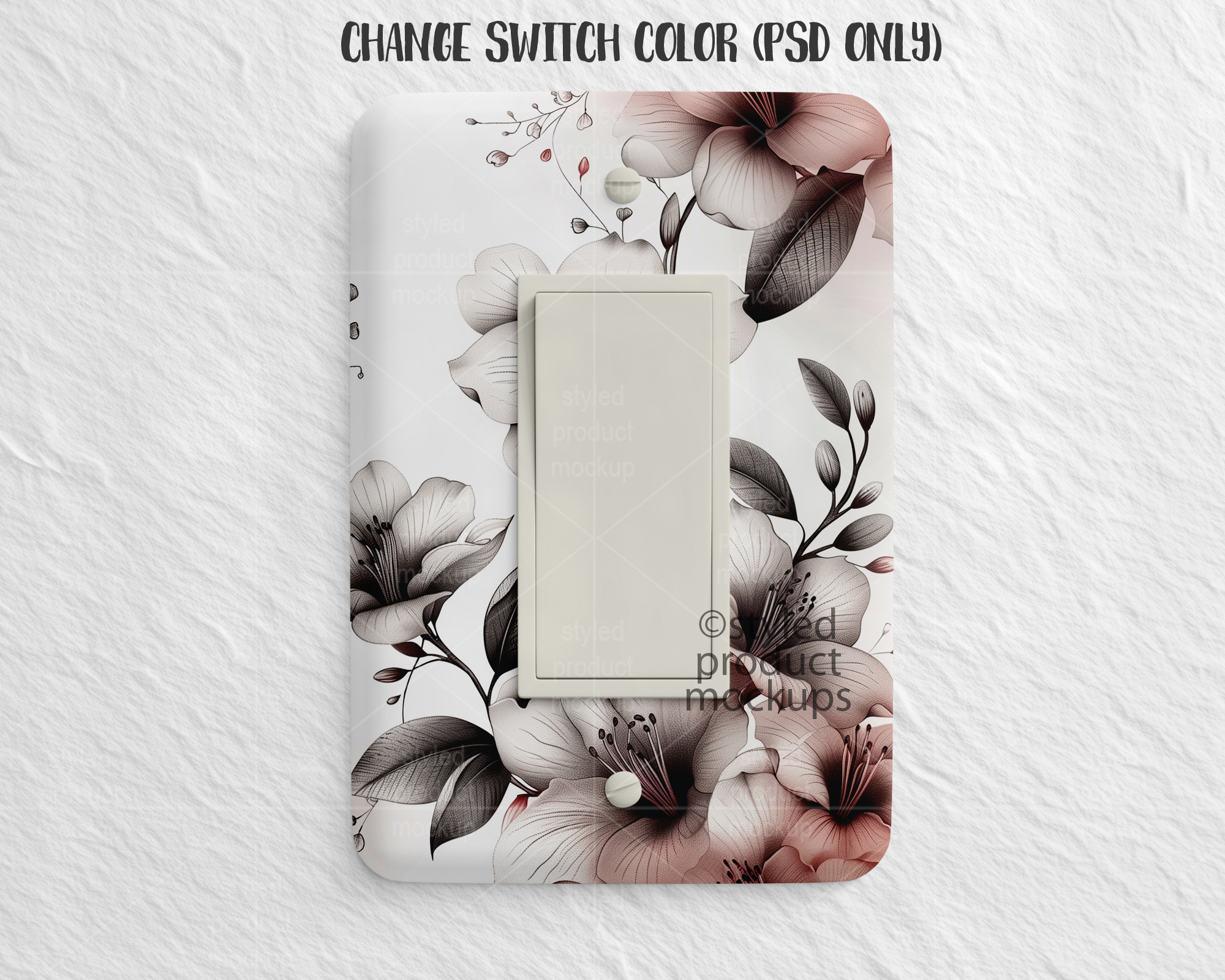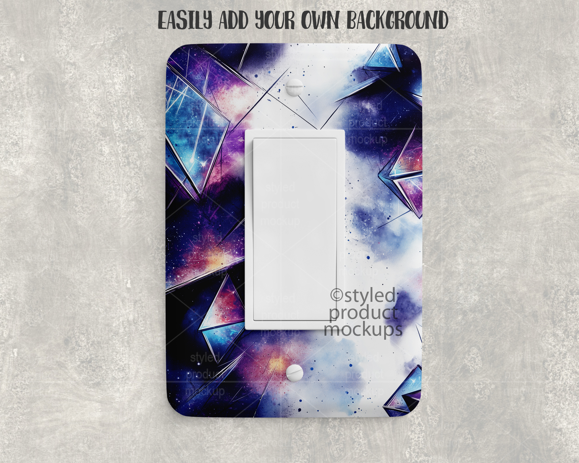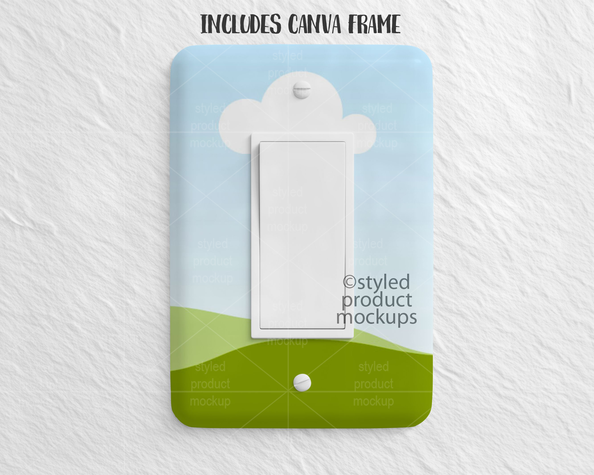 This listing is a mock-up that features a dye sublimation light rocker switch cover. Give a professional touch to your light switch cover designs without the hassle of photographing each one. This styled product mockups template is ready to use, simply add in your own art files and background.
