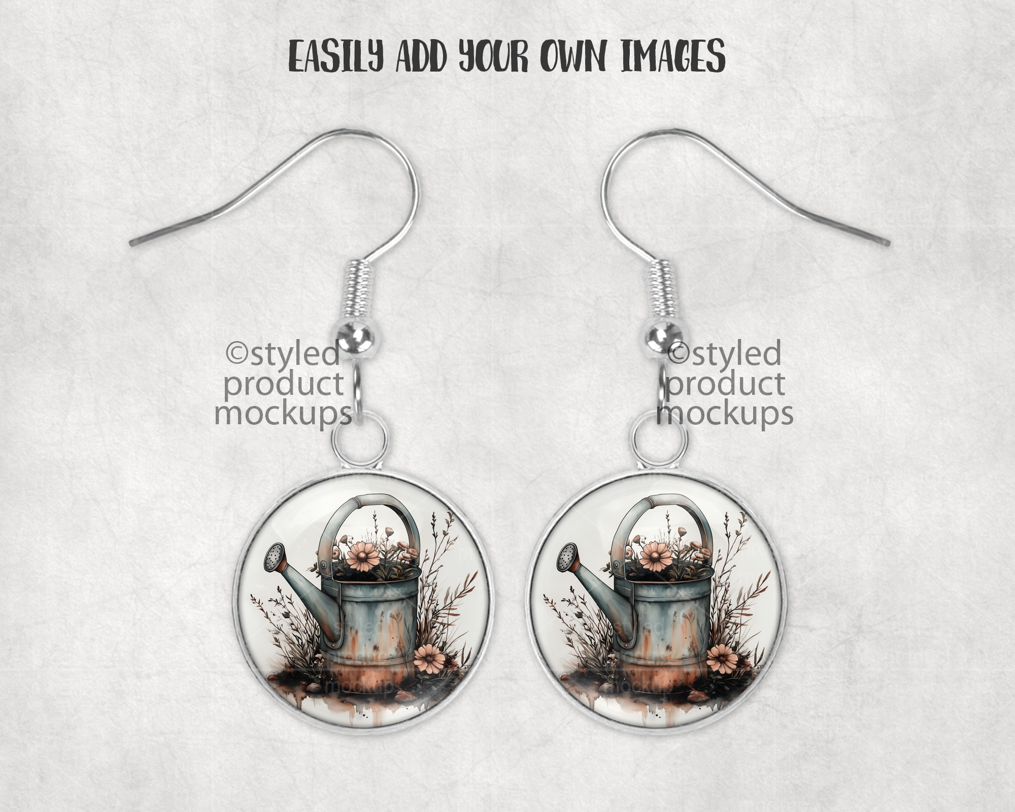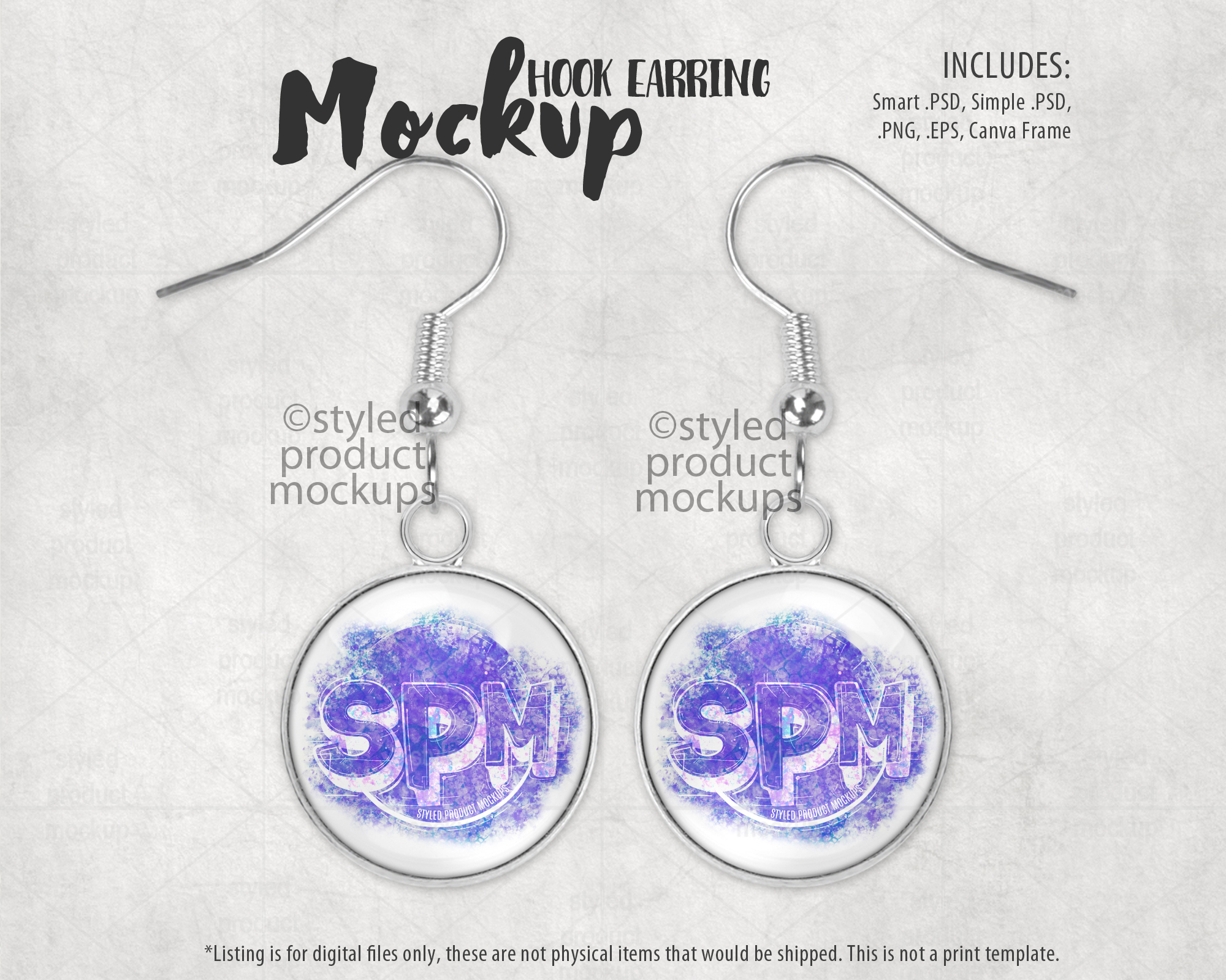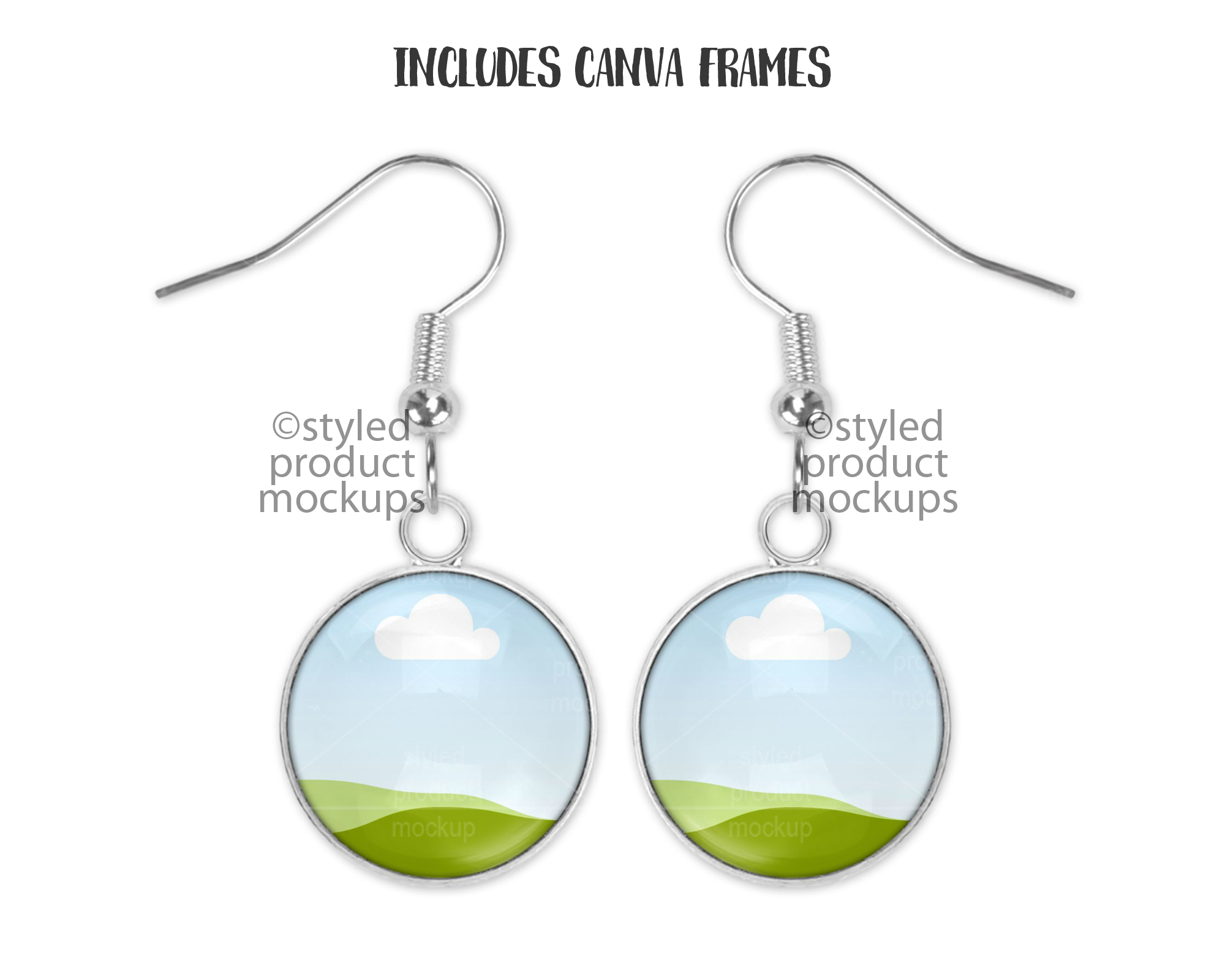 This listing is a mock-up that features a pair of round cabochon tray hook earrings. Give a professional touch to your earring designs without the hassle of photographing each one. This styled product mockups template is ready to use, simply add in your own art files and background.