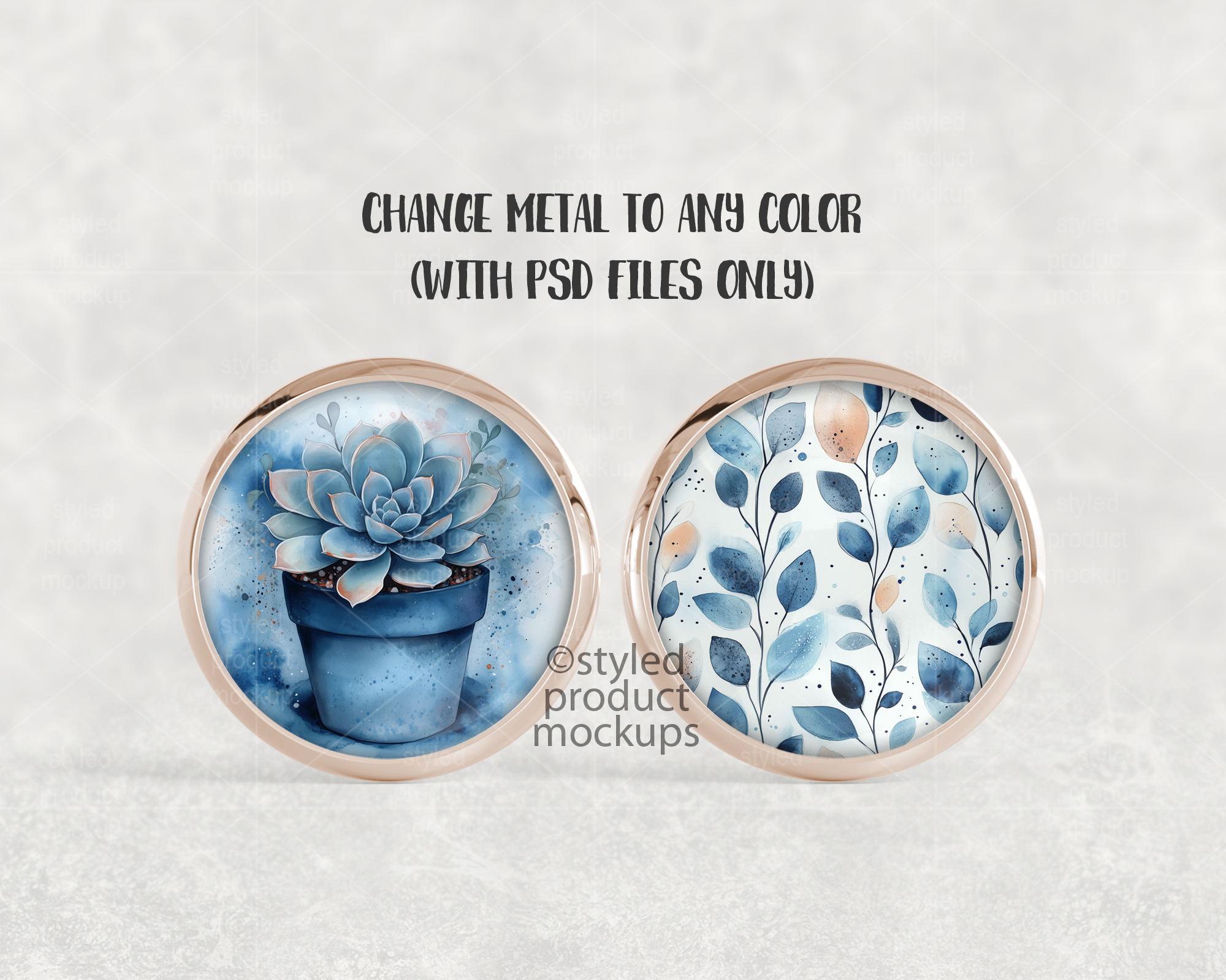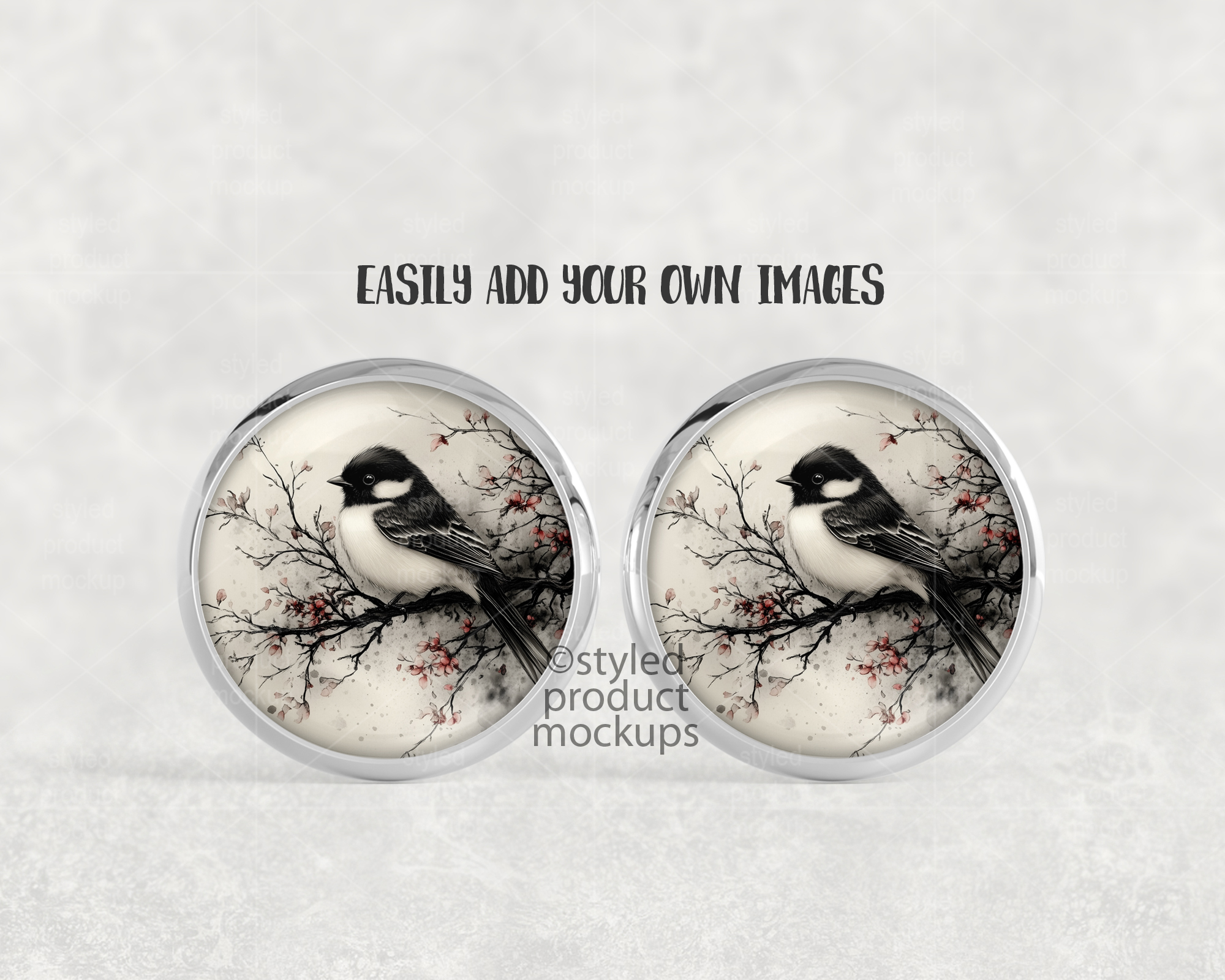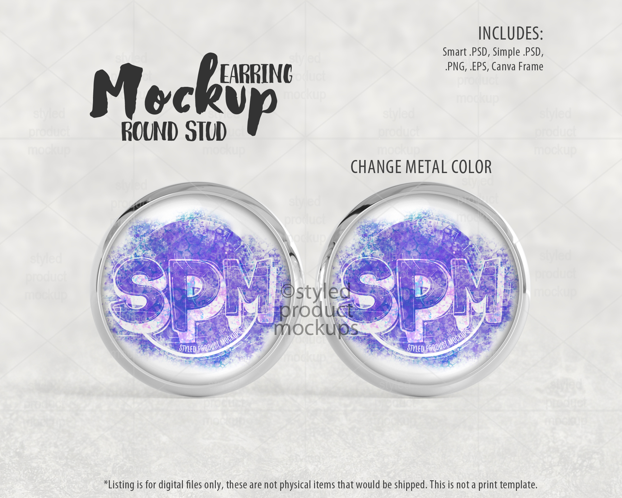 This listing is a mock-up that features a smooth metal tray stud earring. Give a professional touch to your earring designs without the hassle of photographing each one. This styled product mockups template is ready to use, simply add in your own art files and background.