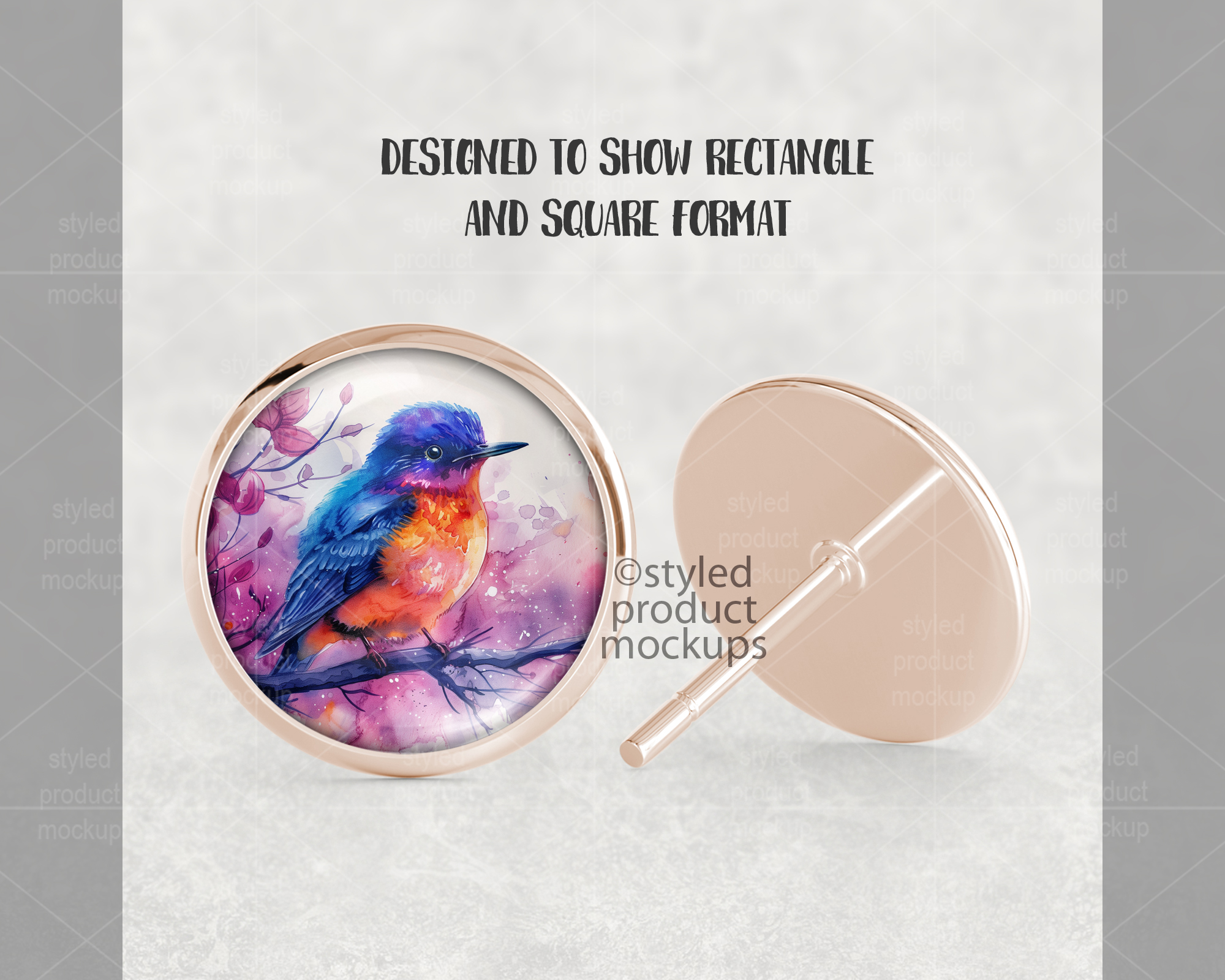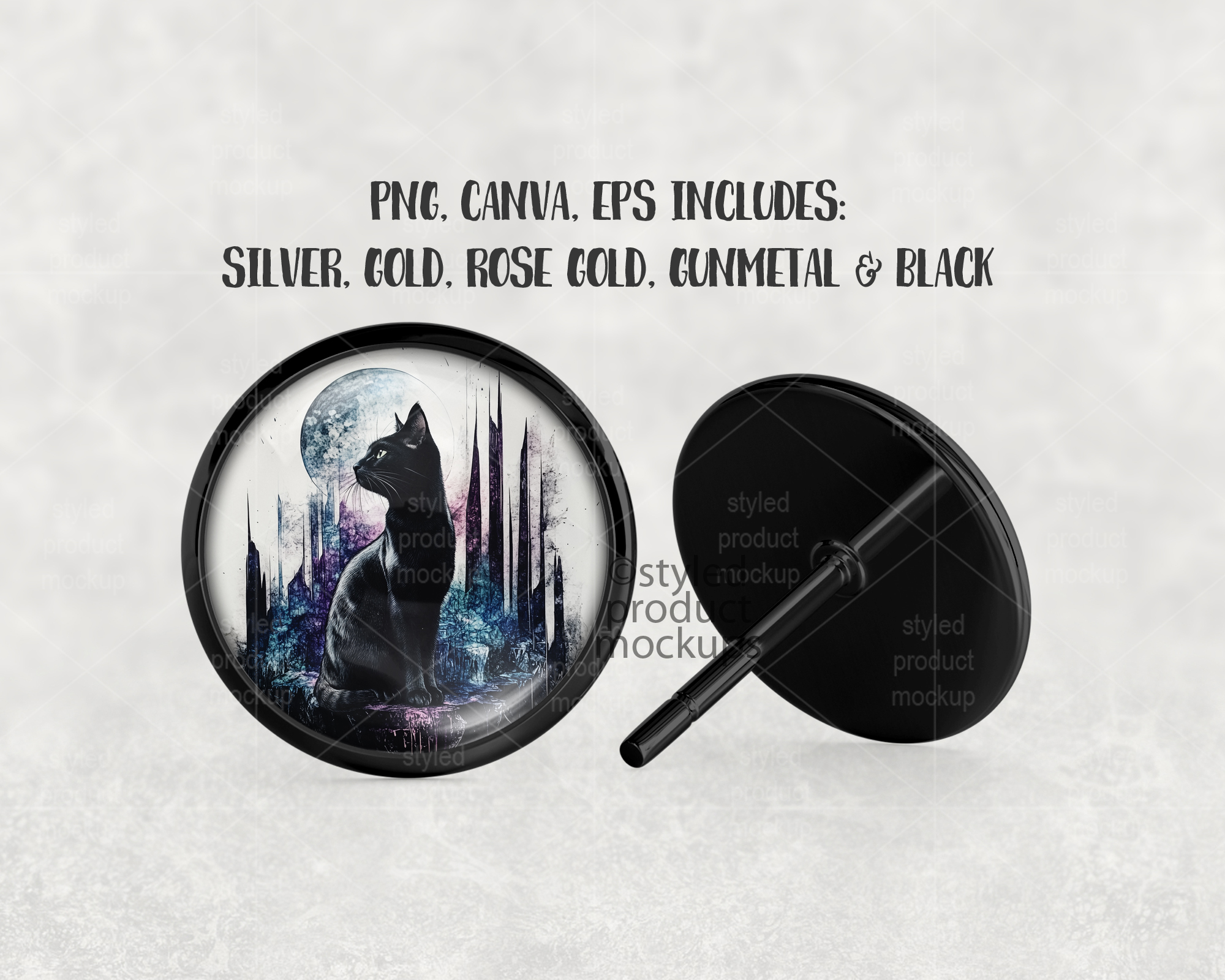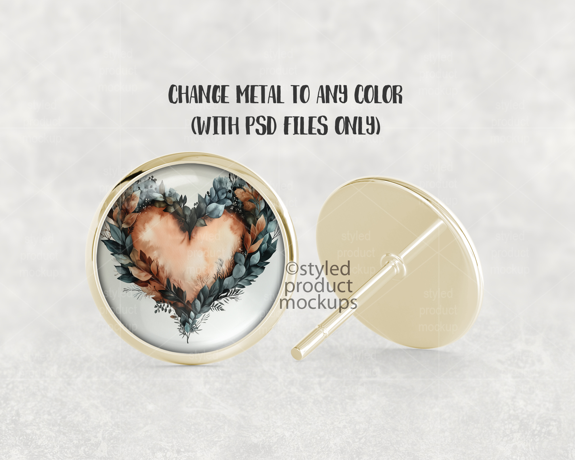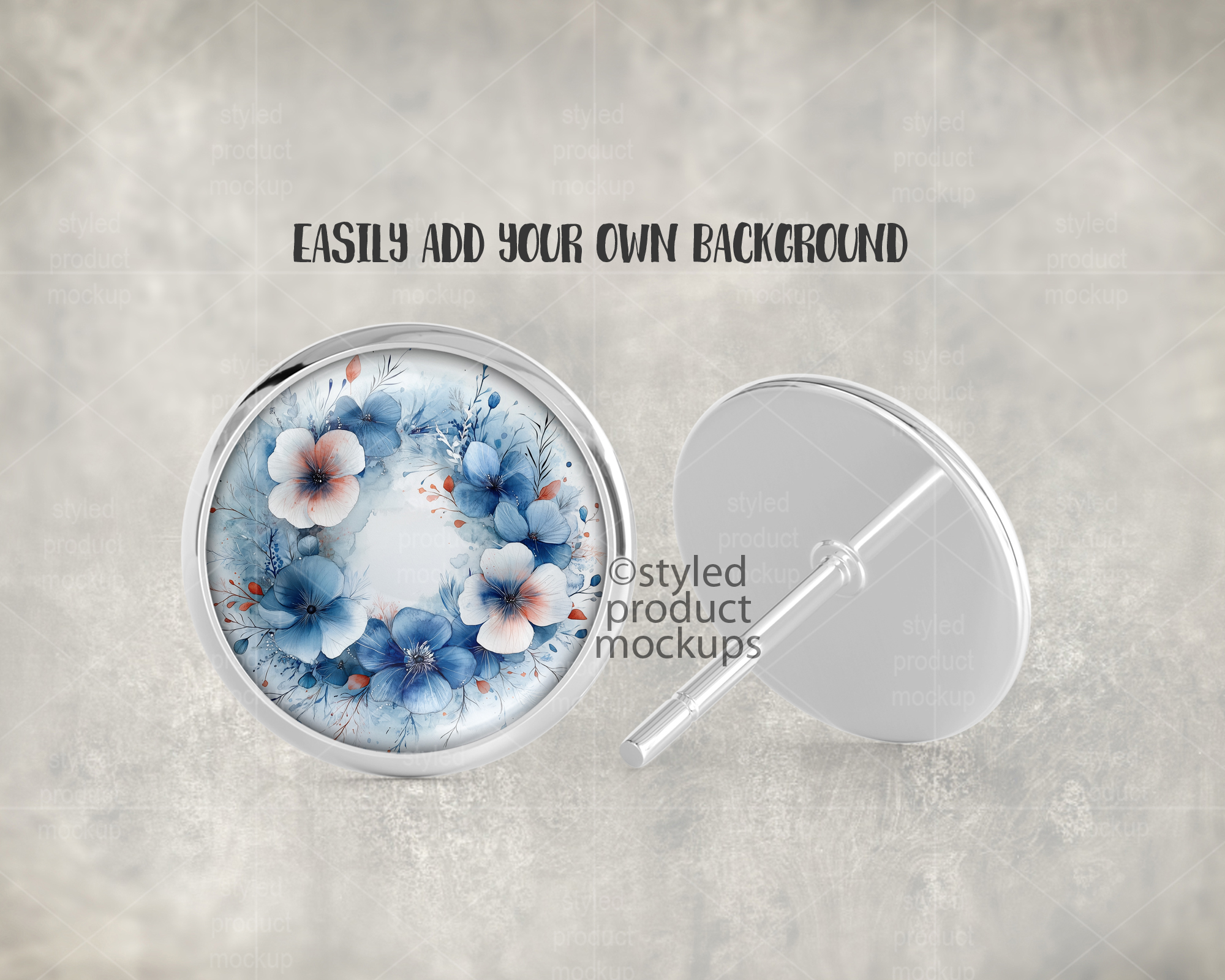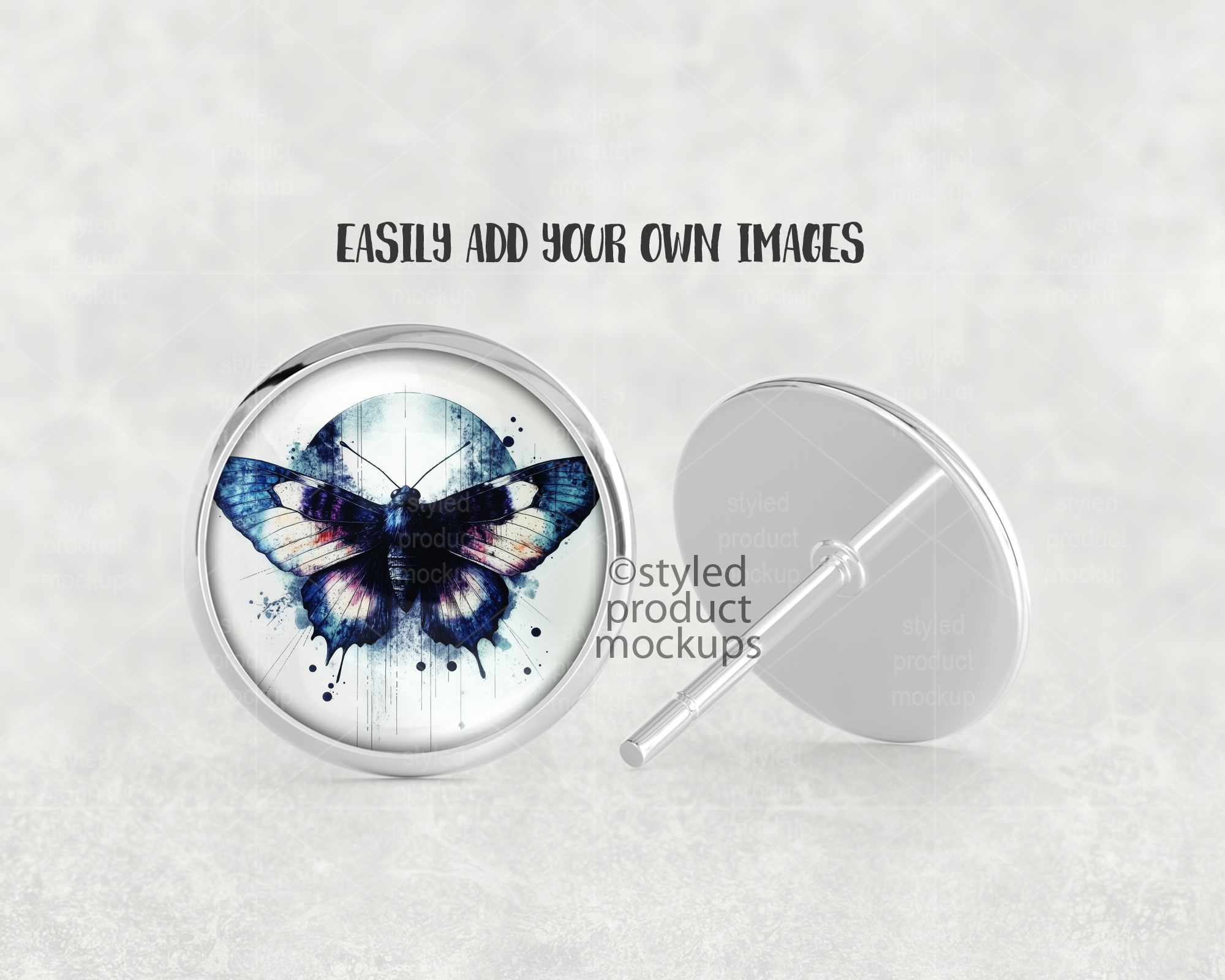 This listing is a mock-up that features the front and back view of a round stud earring with glass cabochon. Give a professional touch to your earring designs without the hassle of photographing each one. This styled product mockups template is ready to use, simply add in your own art files and background.