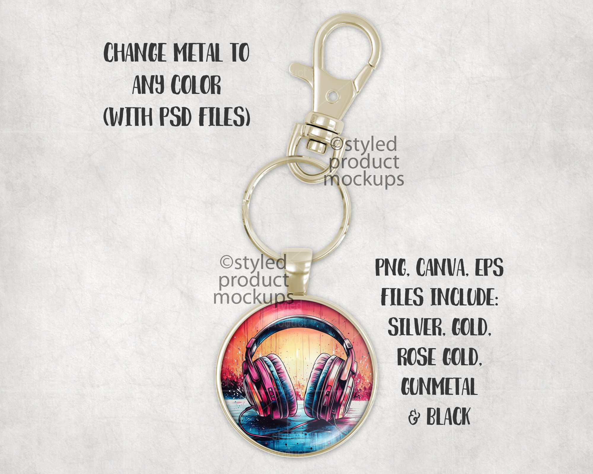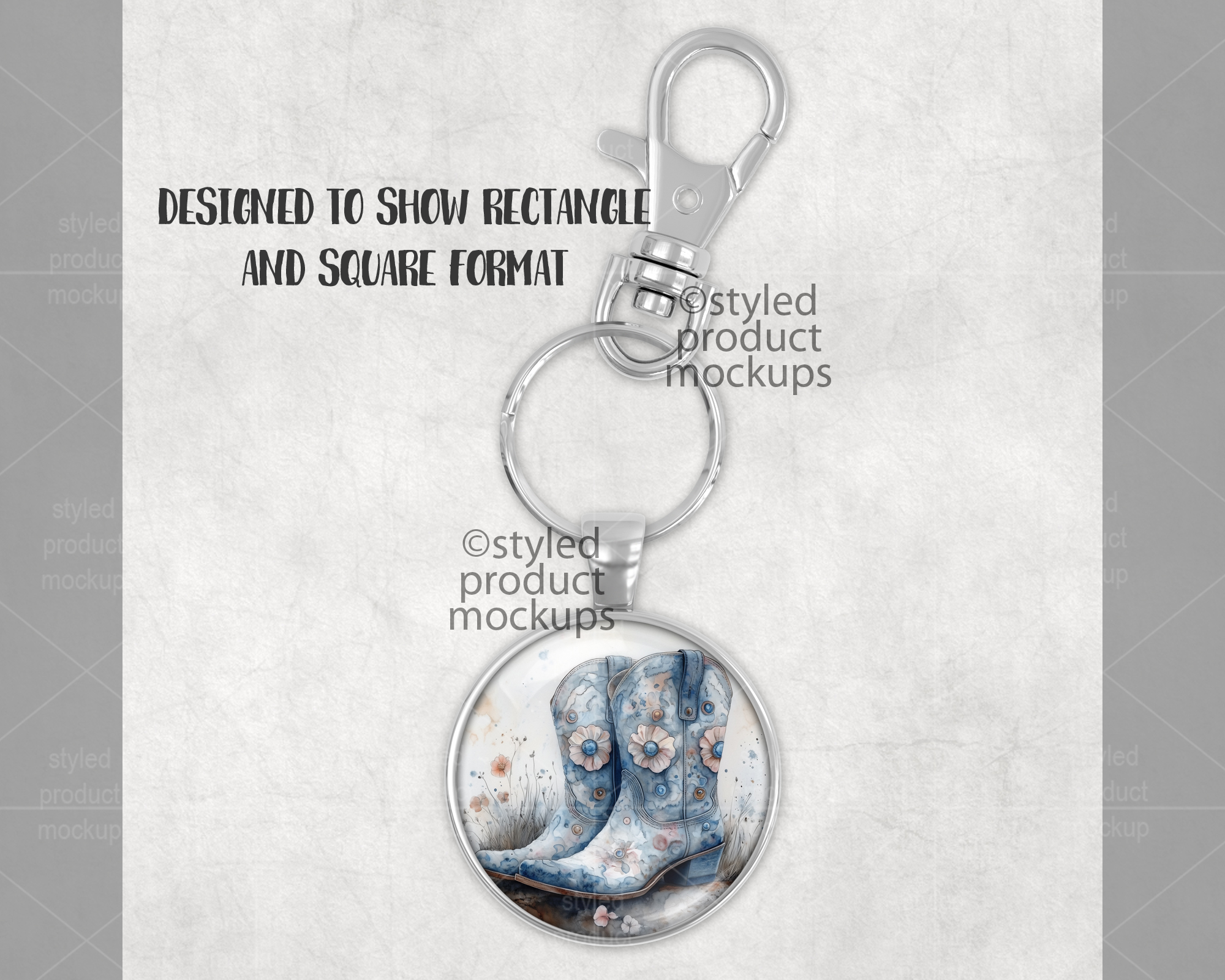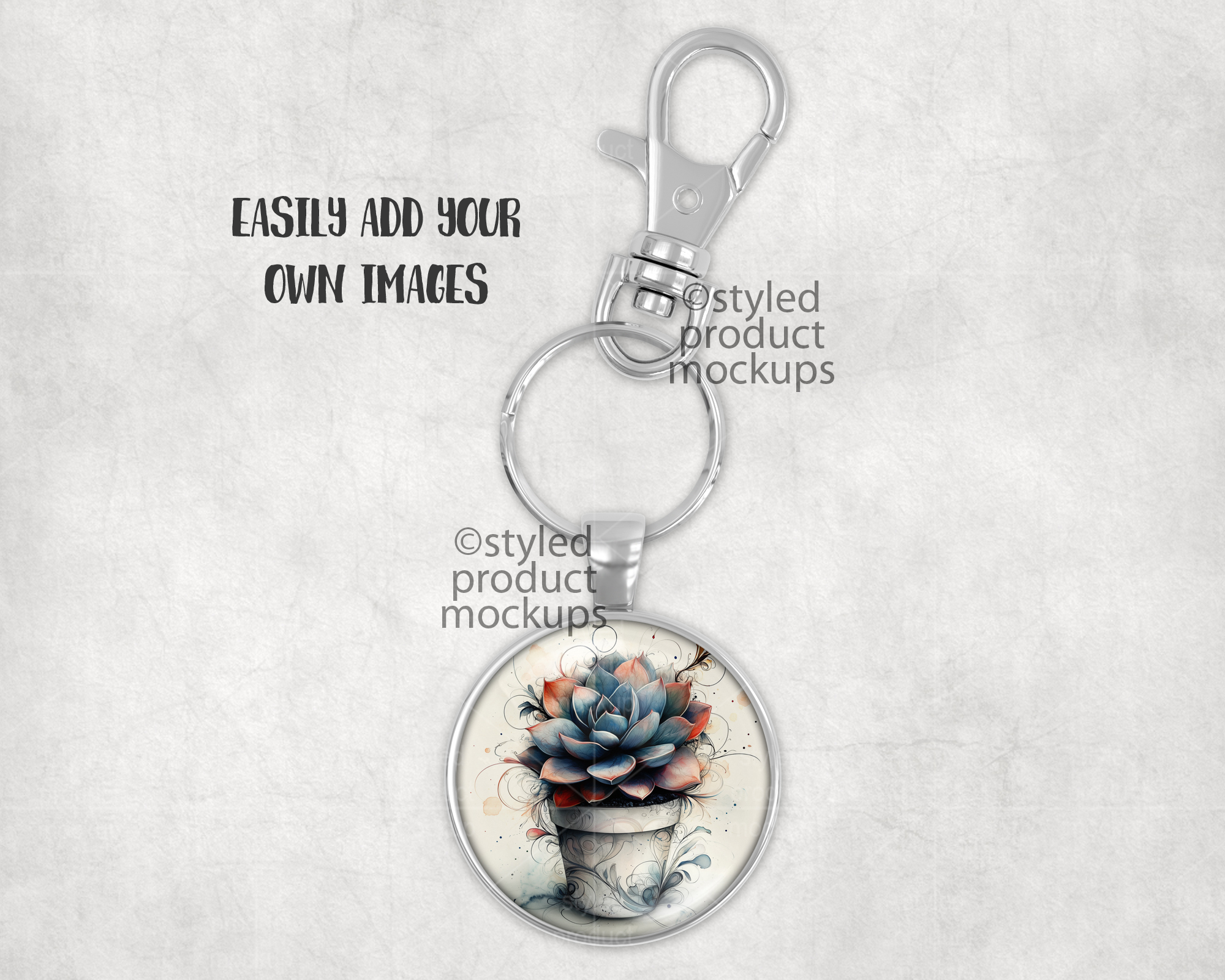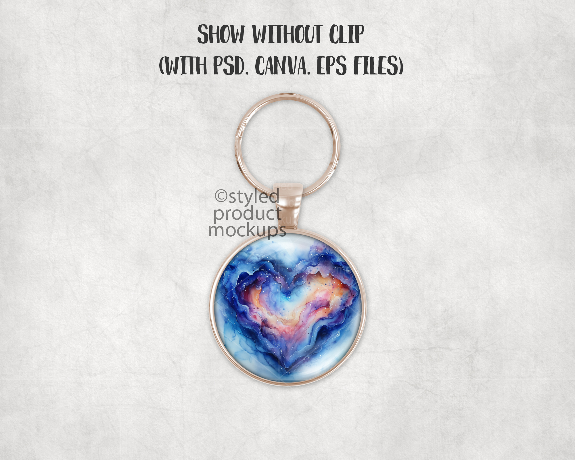 Round Tray Keychain Mockup with glass cabochon, split ring and alligator clip | Add your own image and background