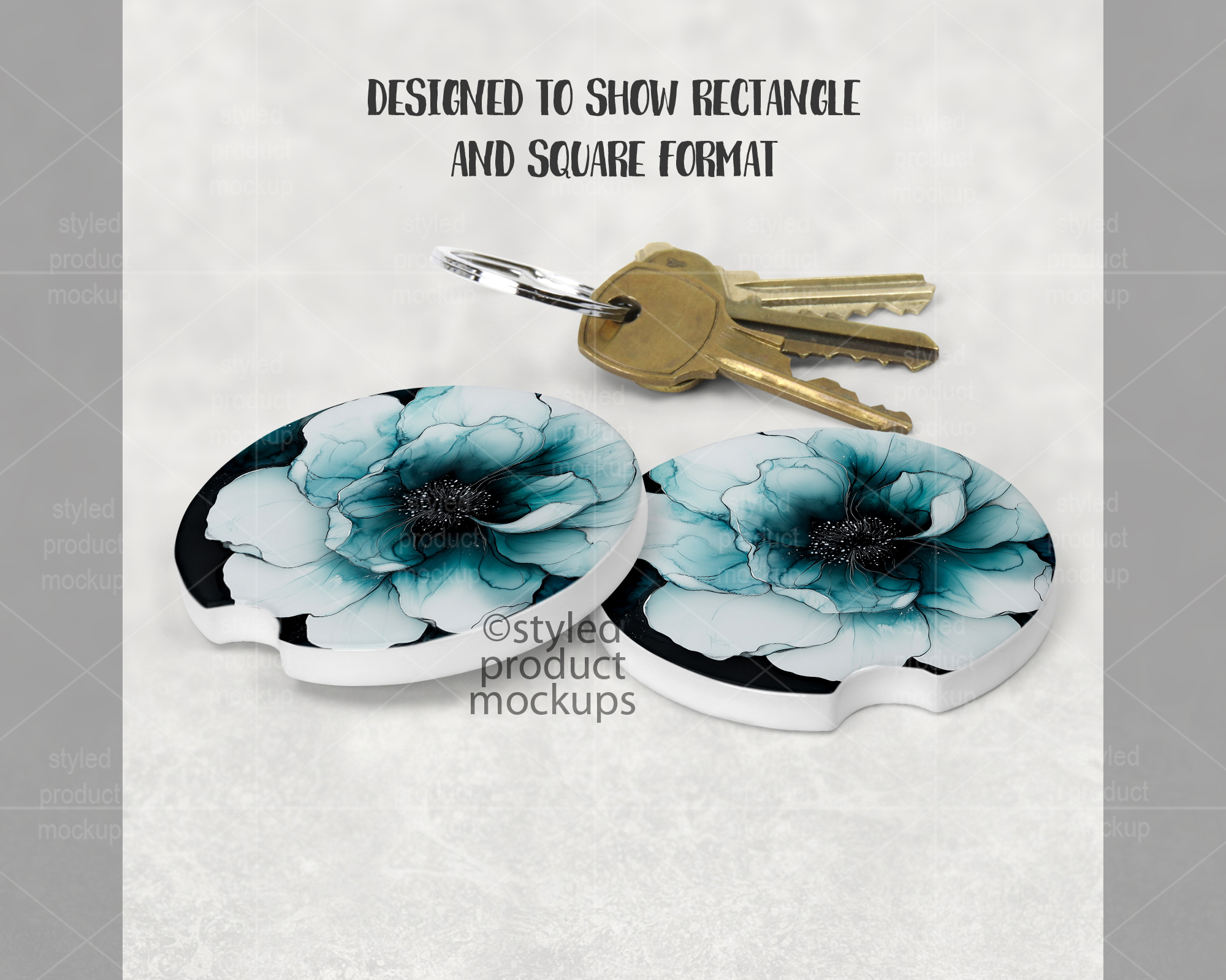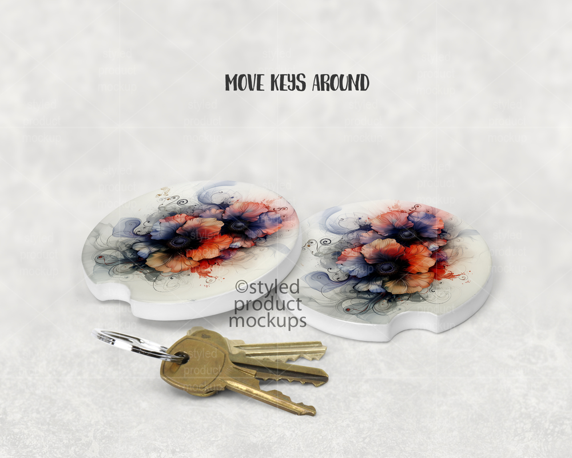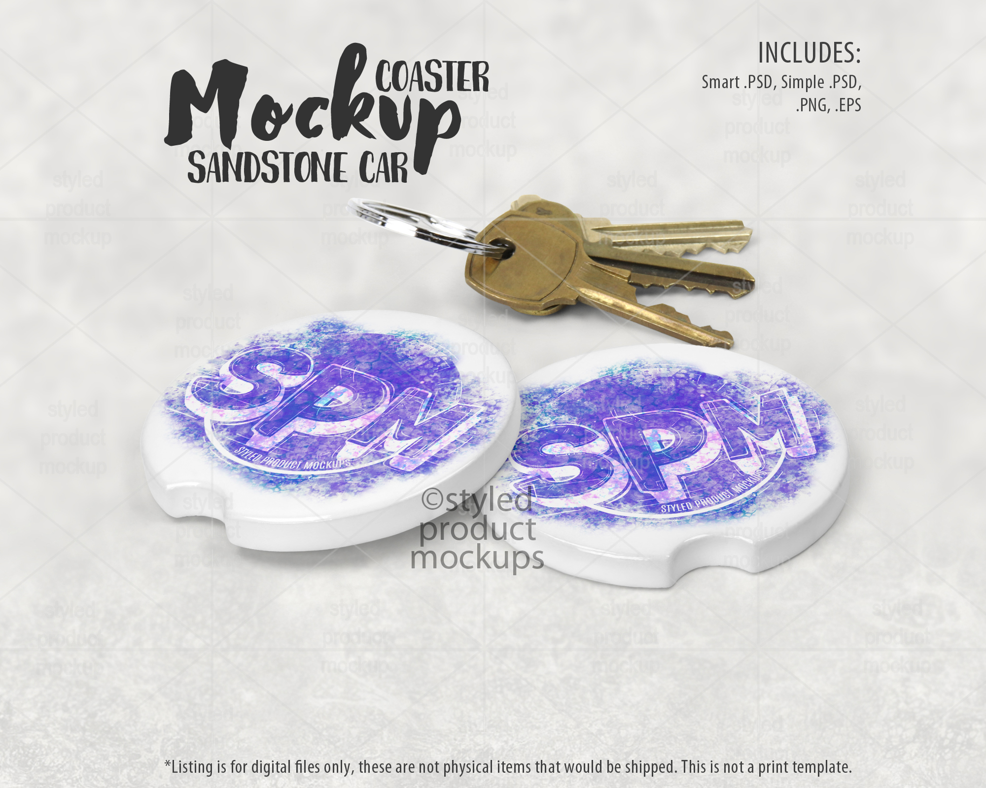 This listing is a mock-up that features a dye sublimation sandstone car coaster shown at an angle with keys. Give a professional touch to your car coaster designs without the hassle of photographing each one. This styled product mockups template is ready to use, simply add in your own art files and background.