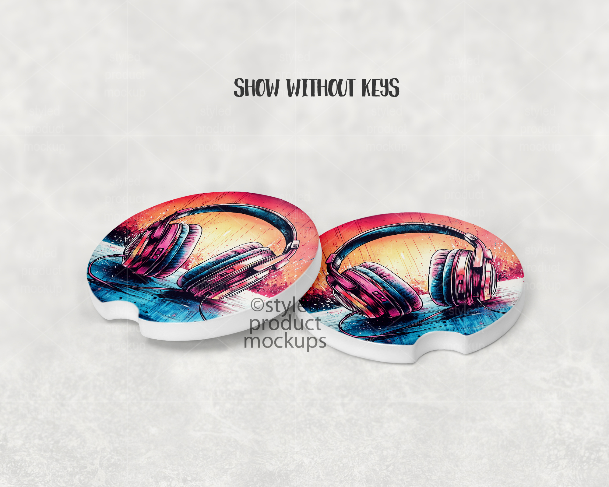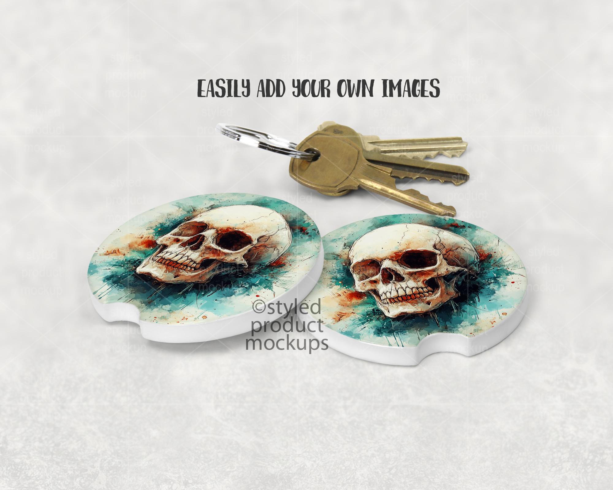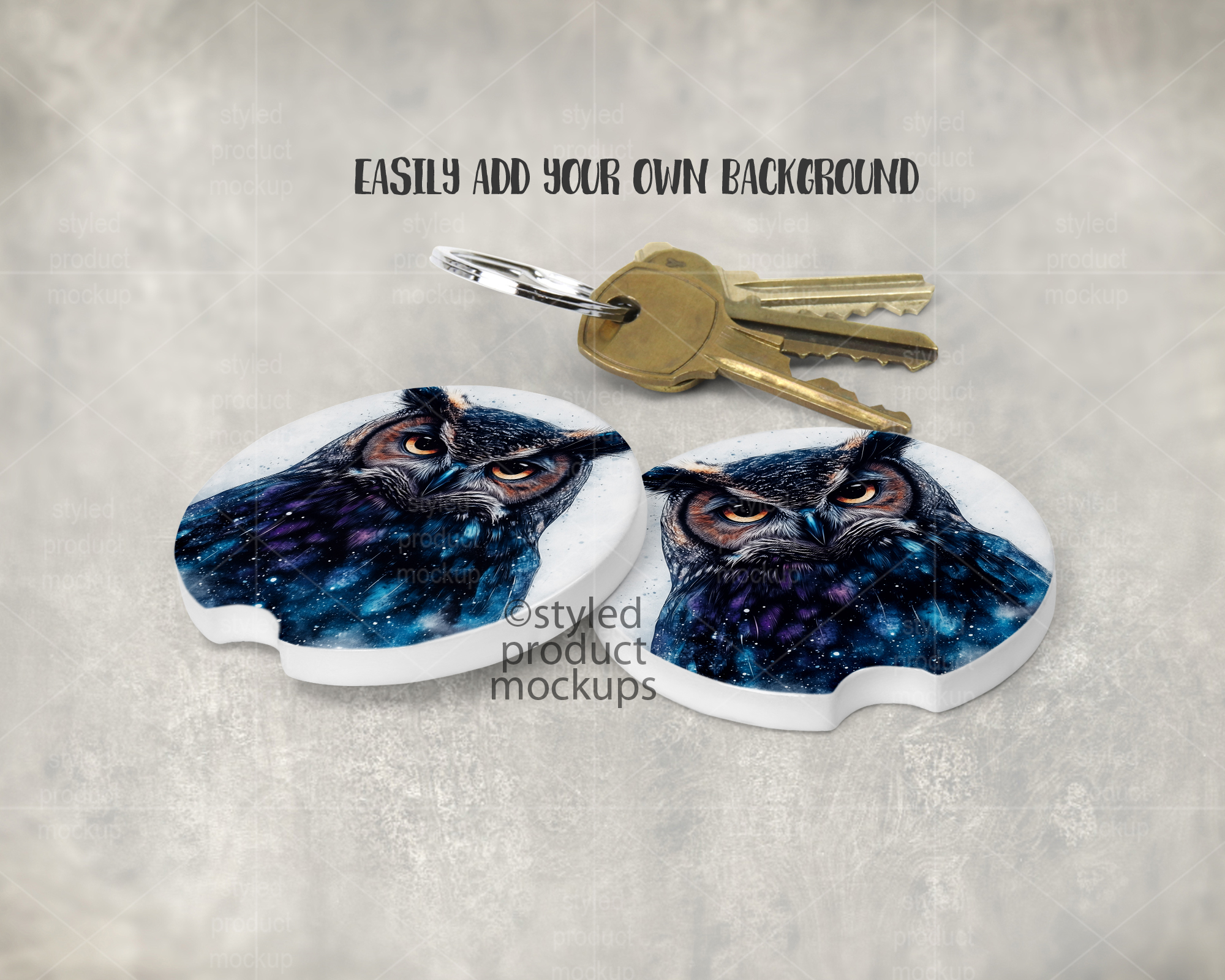 This listing is a mock-up that features a dye sublimation sandstone car coaster shown at an angle with keys. Give a professional touch to your car coaster designs without the hassle of photographing each one. This styled product mockups template is ready to use, simply add in your own art files and background.