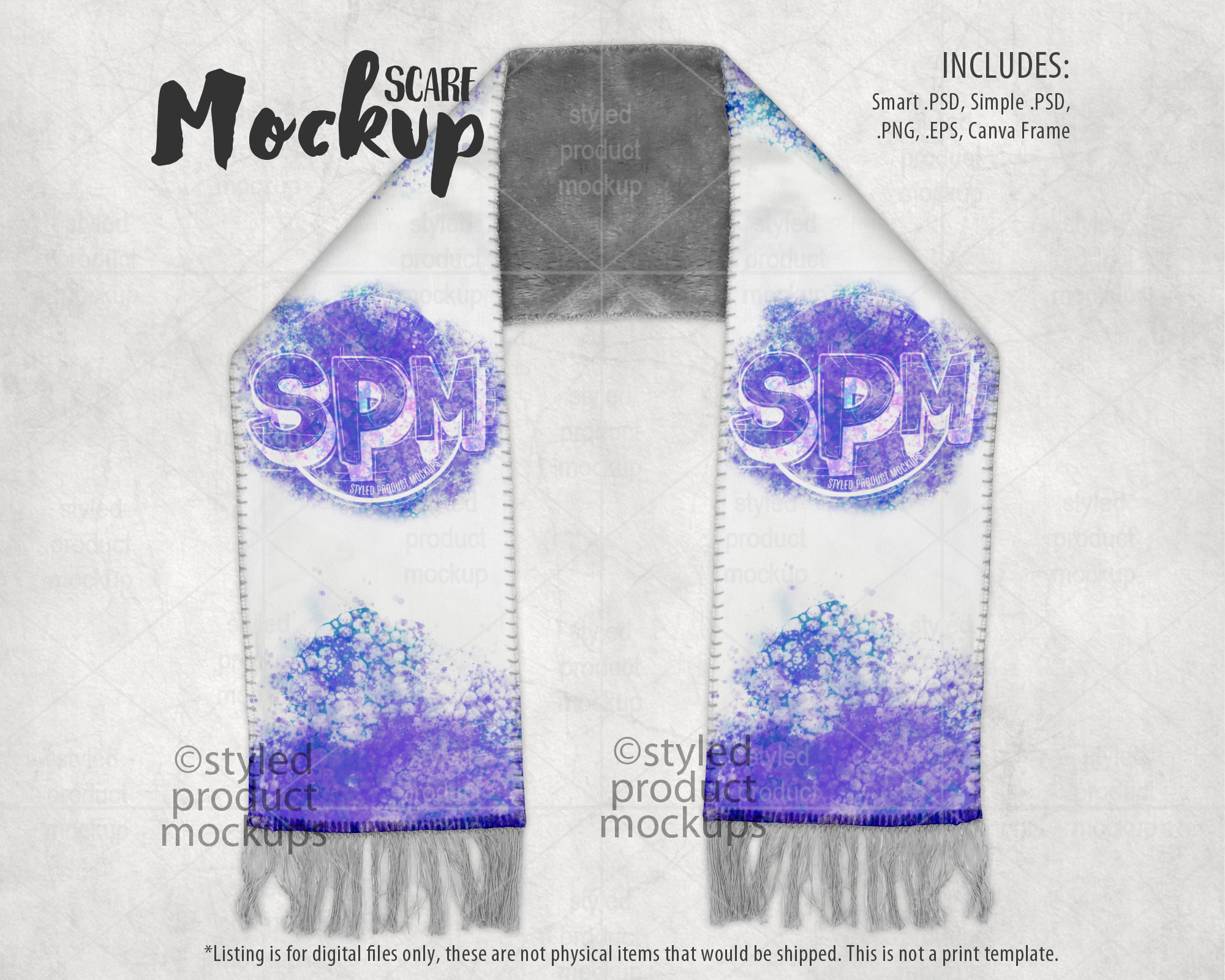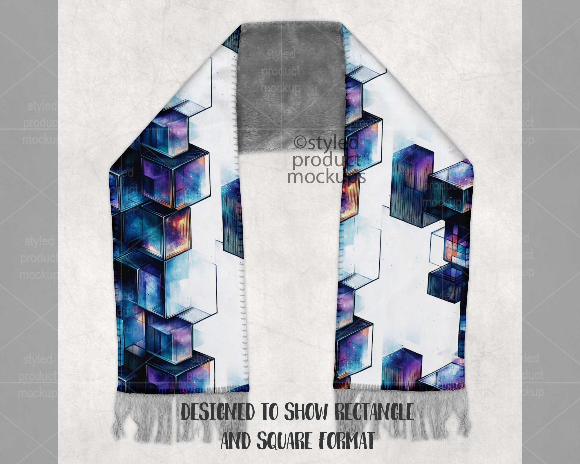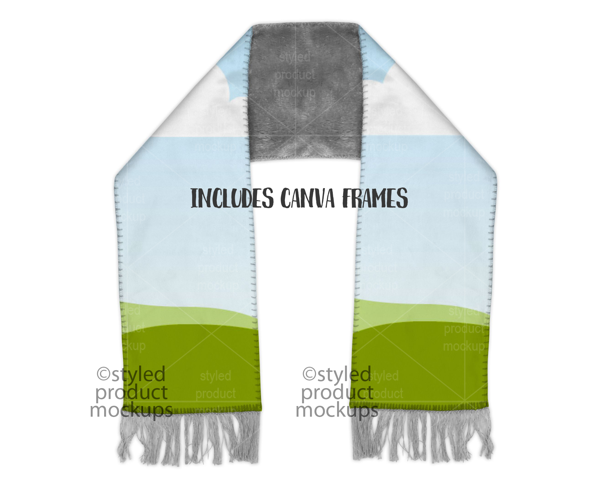 This listing is a mock-up that features a dye sublimation scarf with a grey sherpa fur back and fringe at the bottom ends. Give a professional touch to your scarf designs without the hassle of photographing each one. This styled product mockups template is ready to use, simply add in your own art files and background.