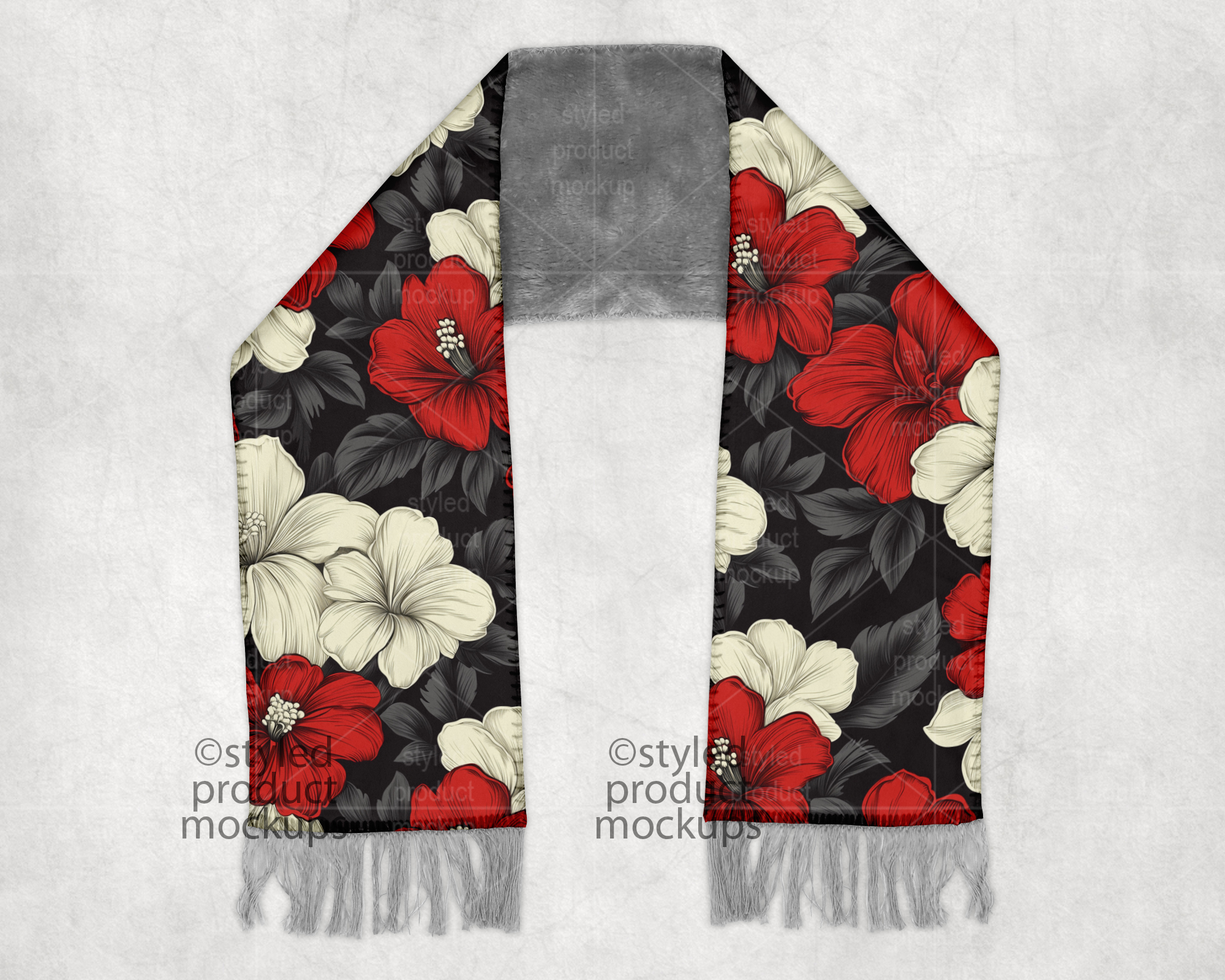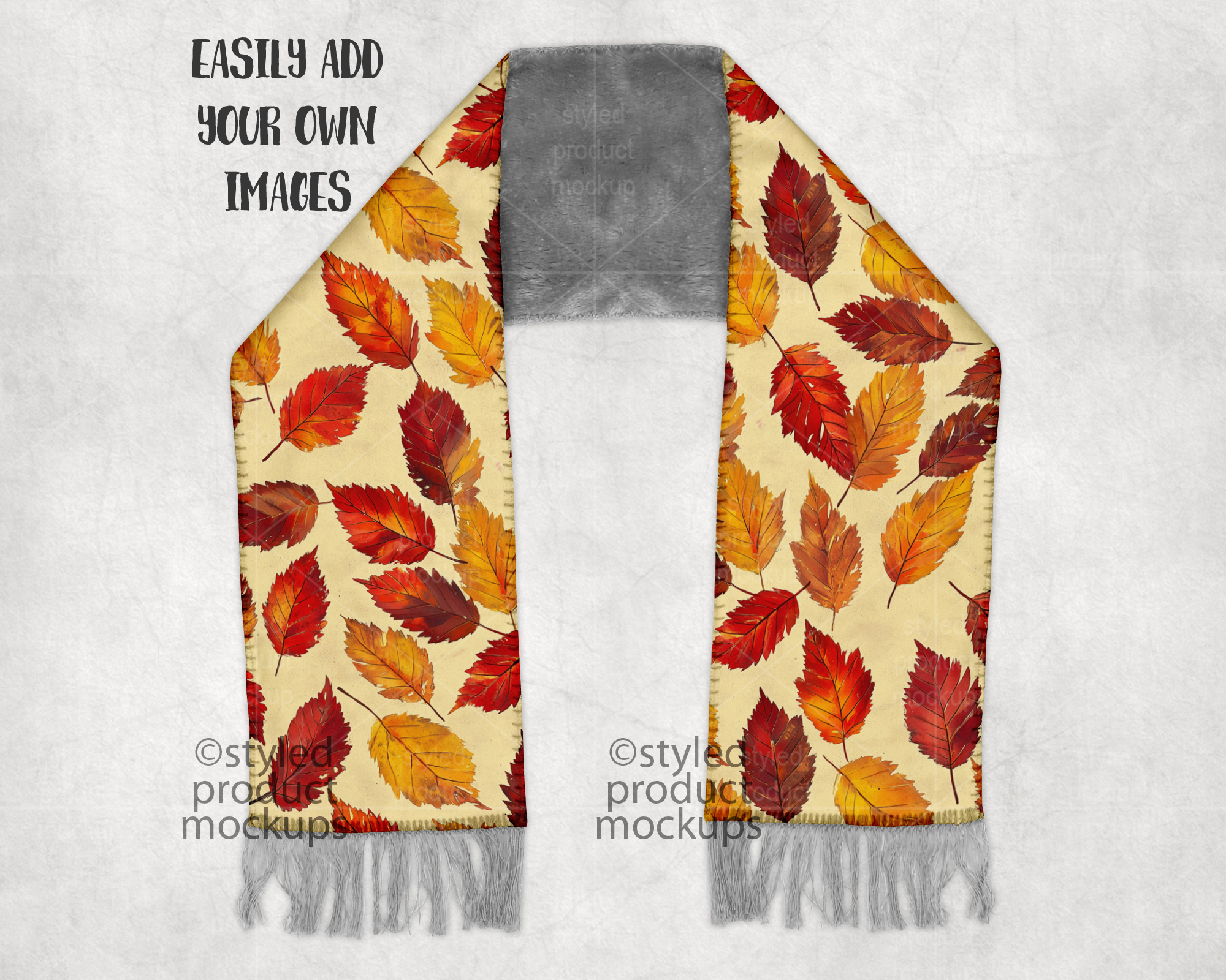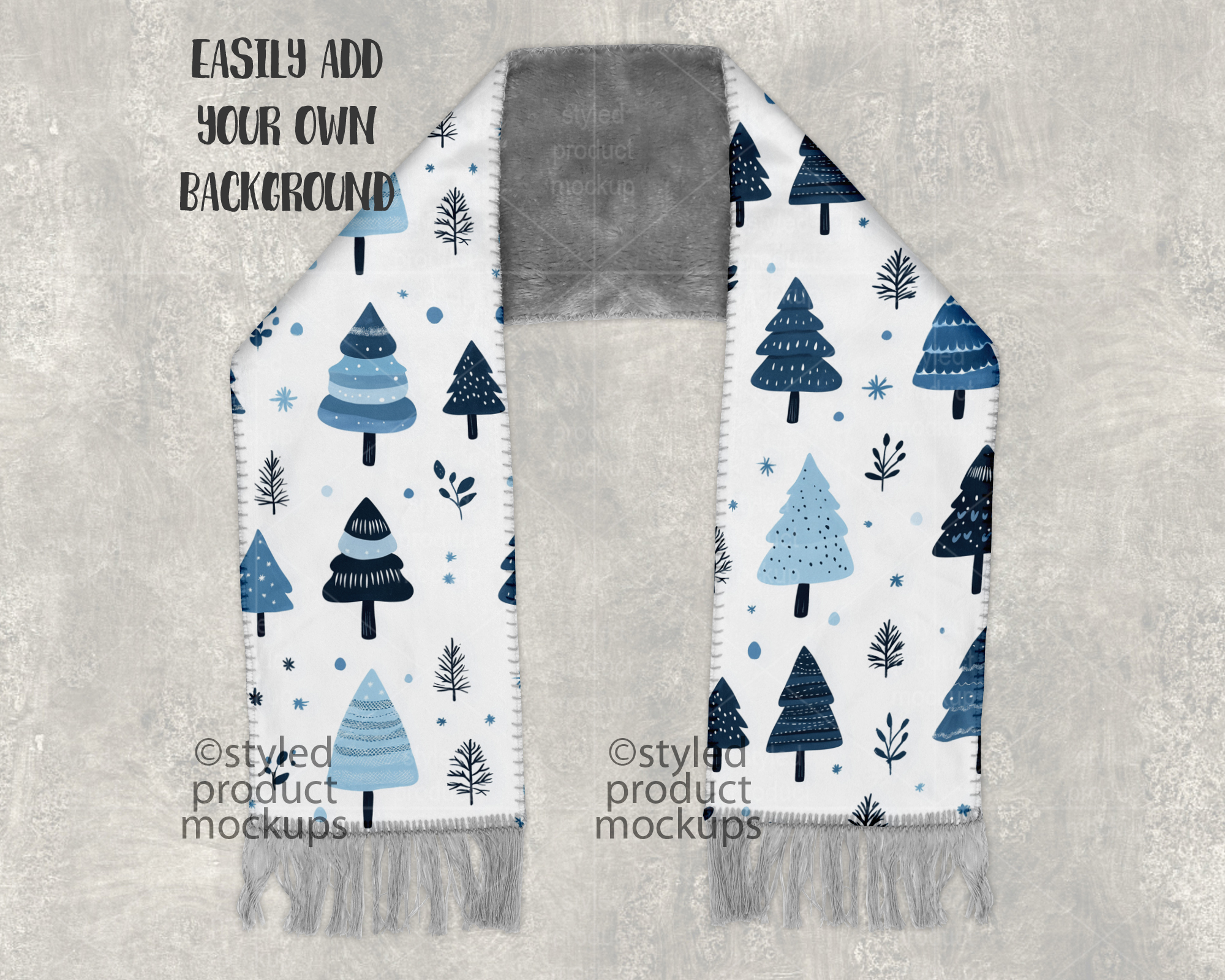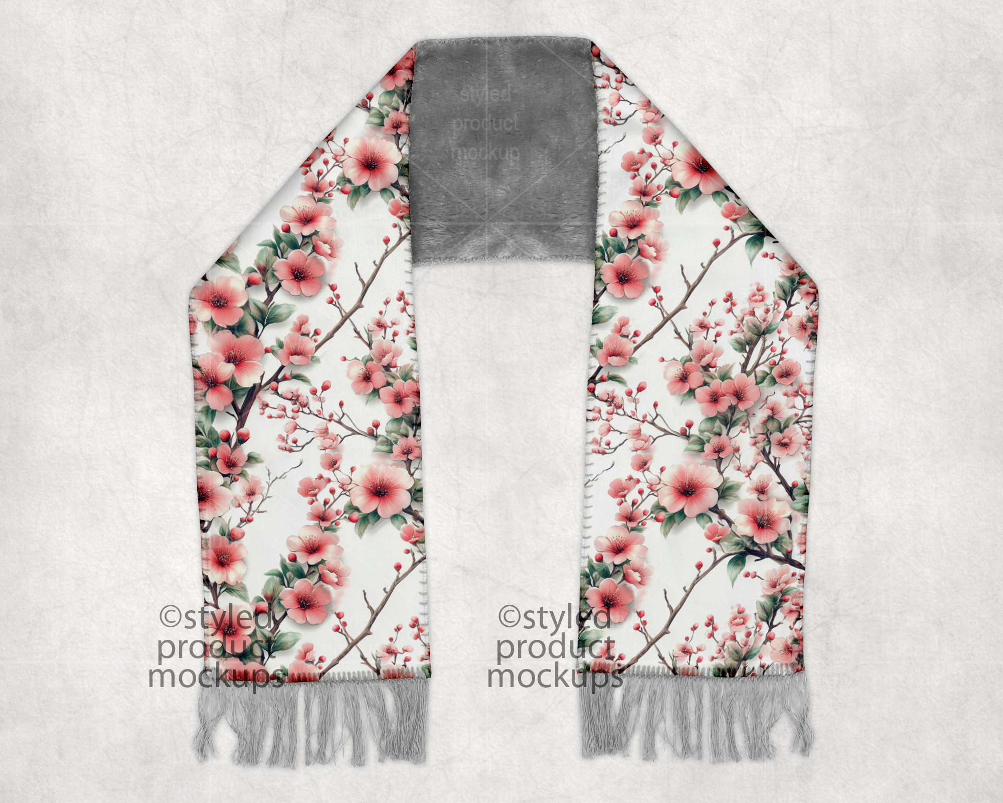 This listing is a mock-up that features a dye sublimation scarf with a grey sherpa fur back and fringe at the bottom ends. Give a professional touch to your scarf designs without the hassle of photographing each one. This styled product mockups template is ready to use, simply add in your own art files and background.