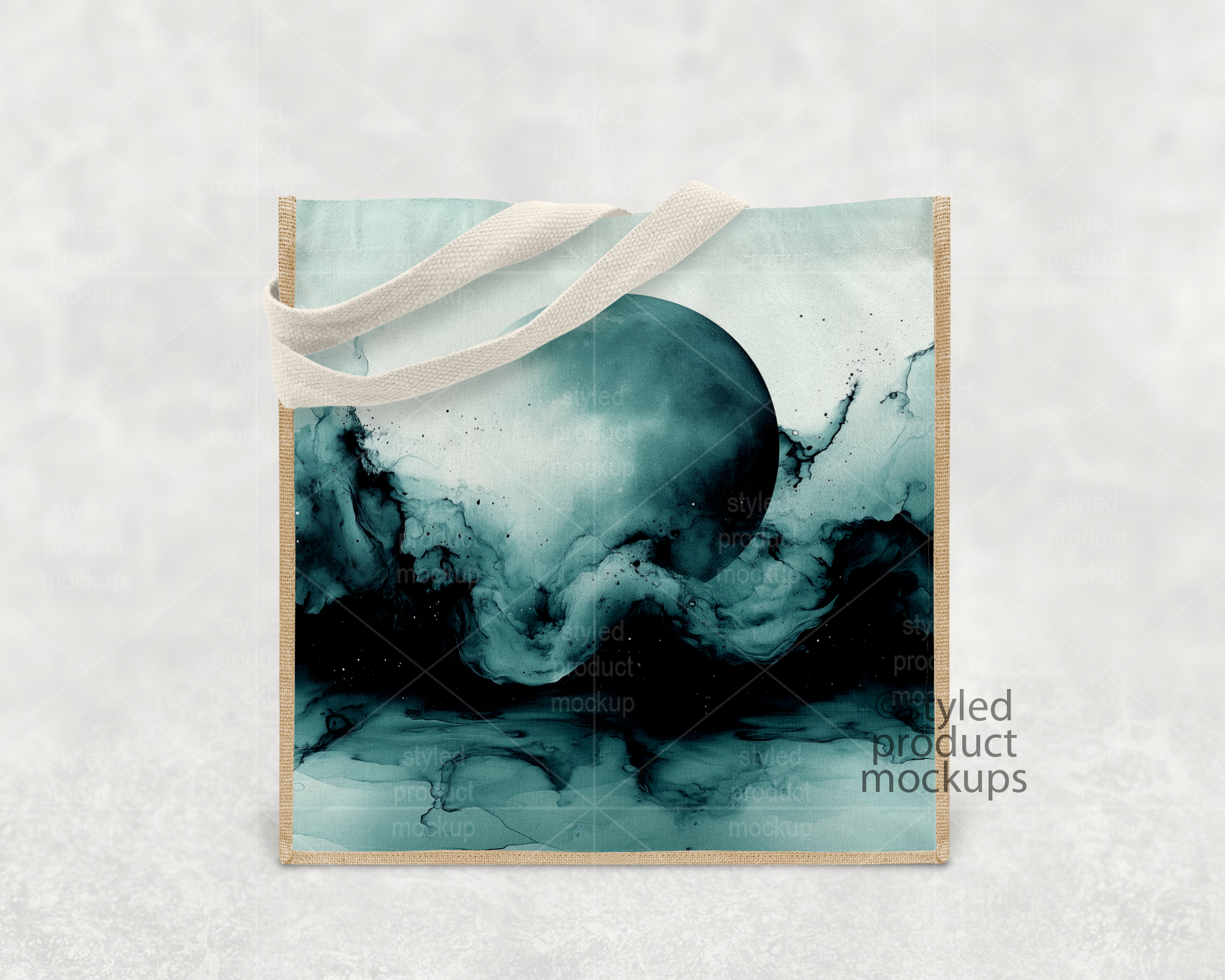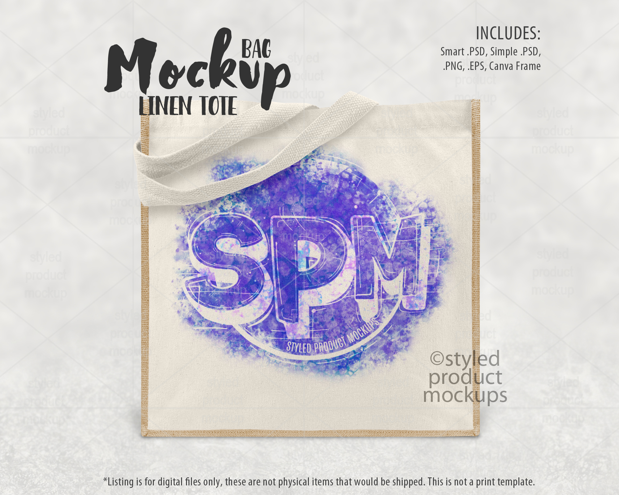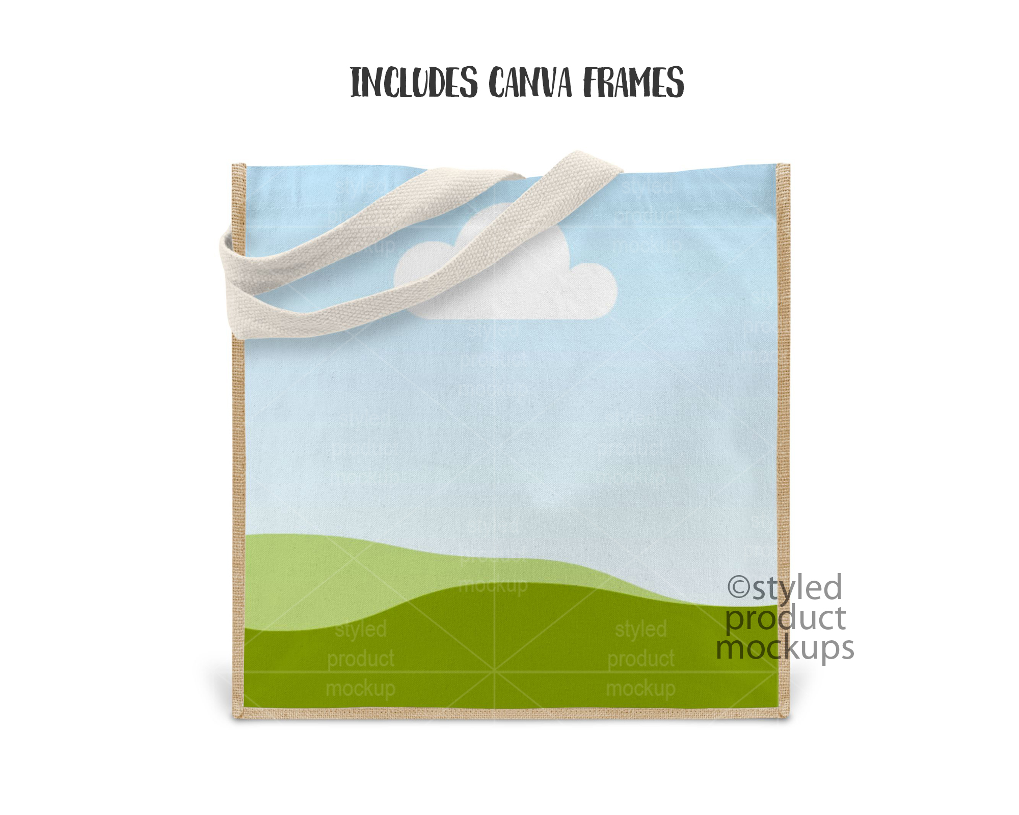This listing is a mock-up that features a dye sublimation jute and linen tote bag measuring 9.8 x 9.8 inches (25 x 25 cm). Give a professional touch to your bag designs without the hassle of photographing each one. This styled product mockups template is ready to use, simply add in your own art files and background.