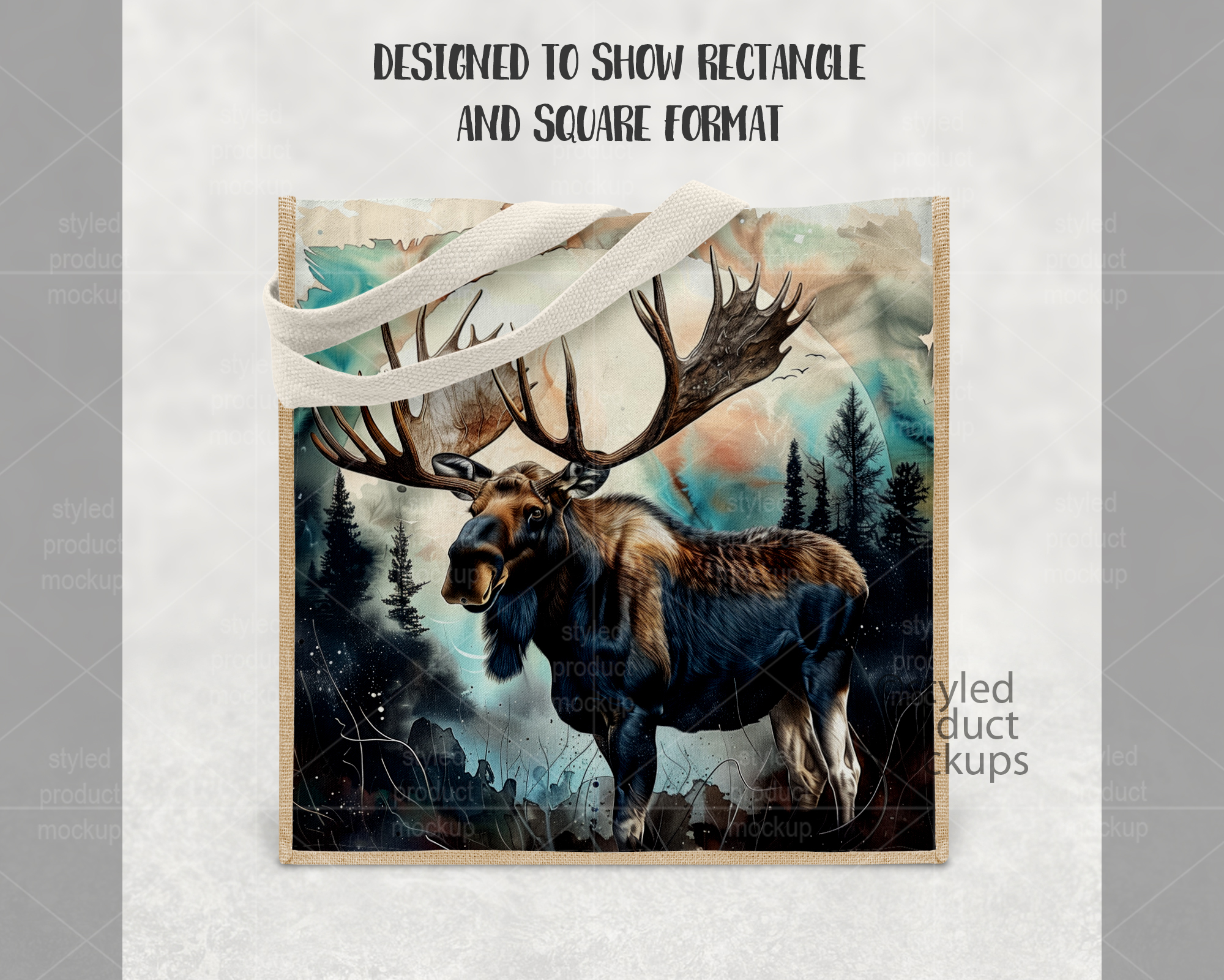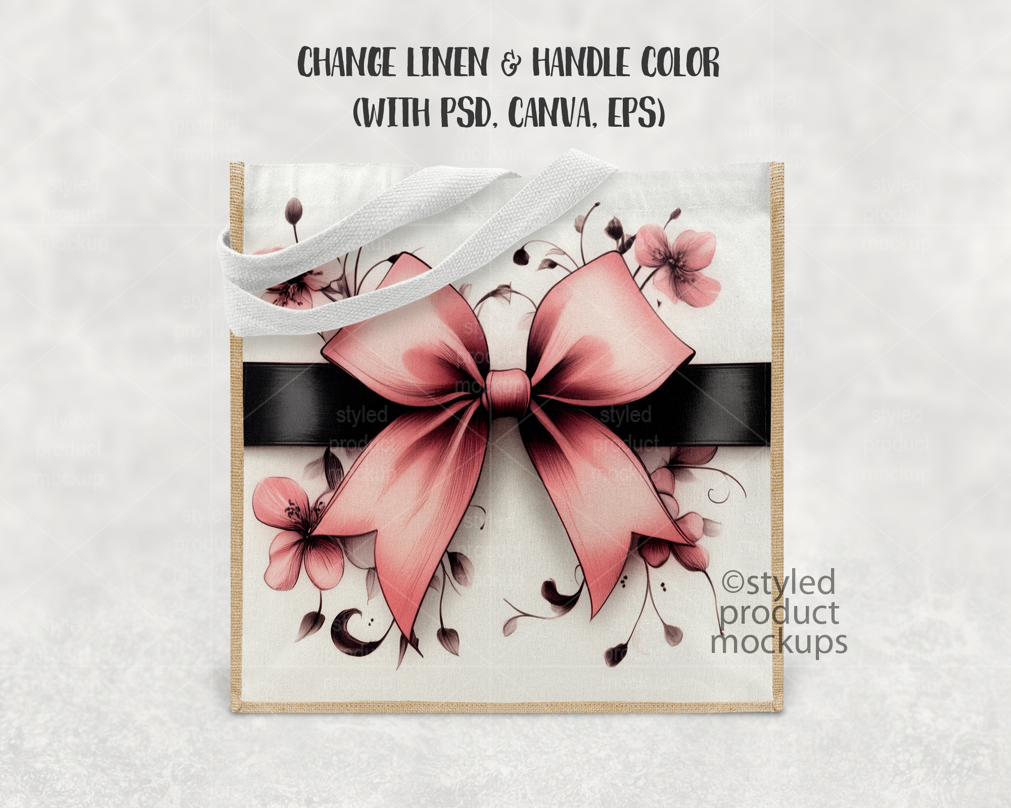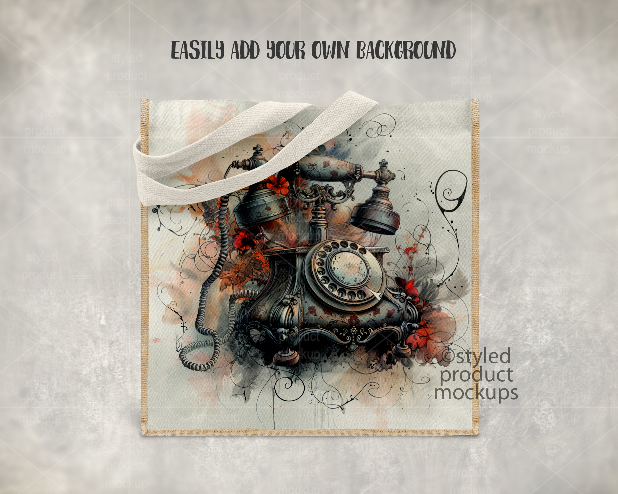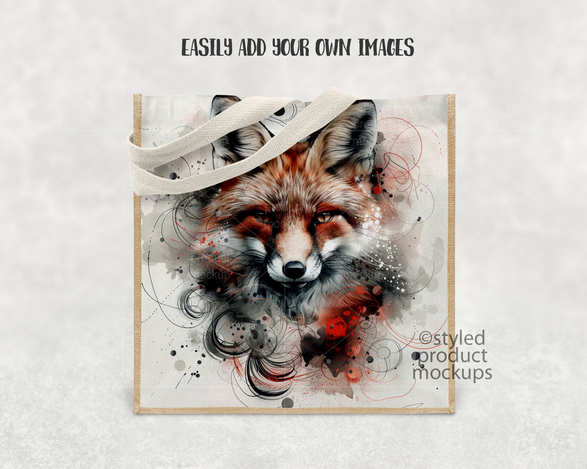 This listing is a mock-up that features a dye sublimation jute and linen tote bag measuring 9.8 x 9.8 inches (25 x 25 cm). Give a professional touch to your bag designs without the hassle of photographing each one. This styled product mockups template is ready to use, simply add in your own art files and background.