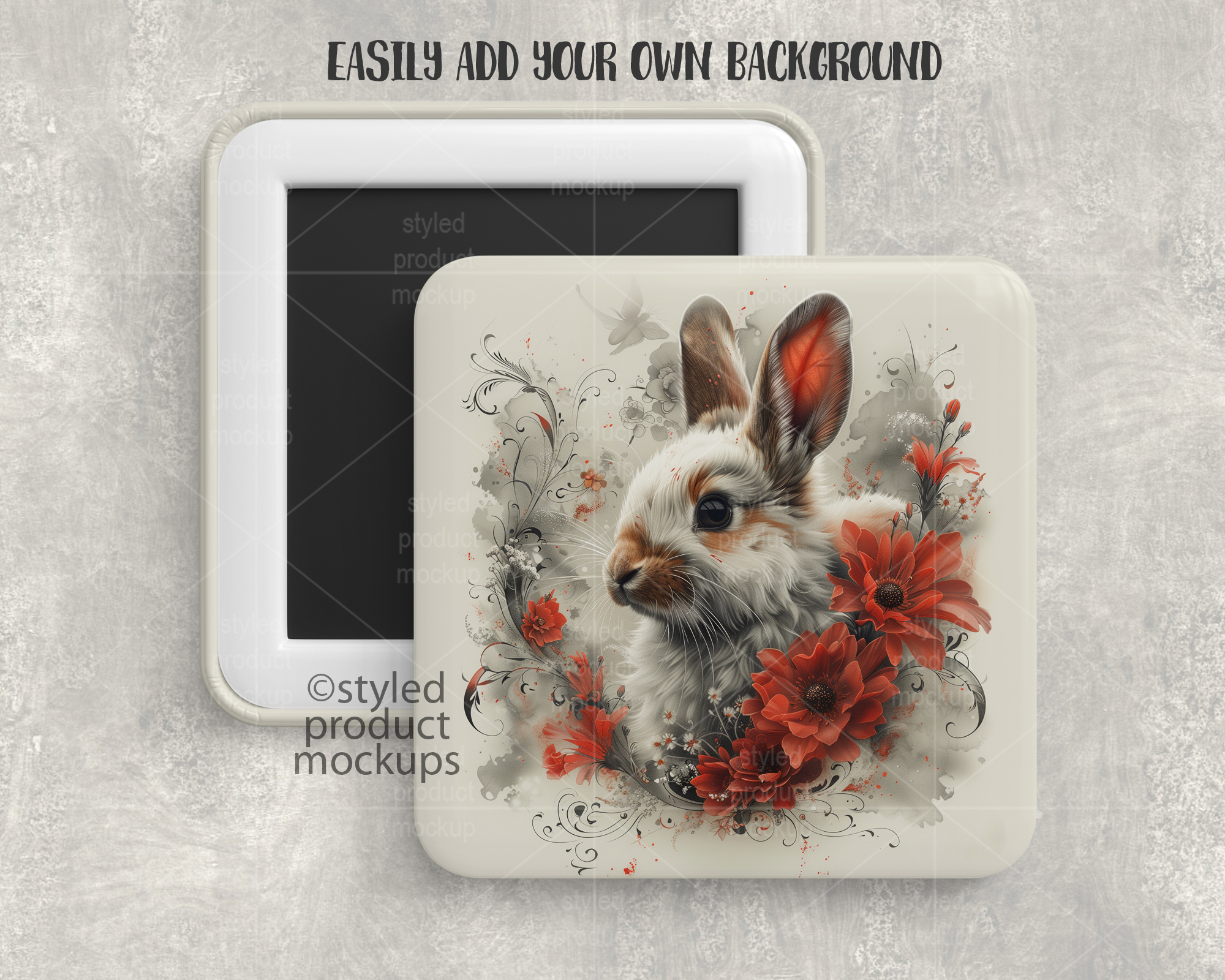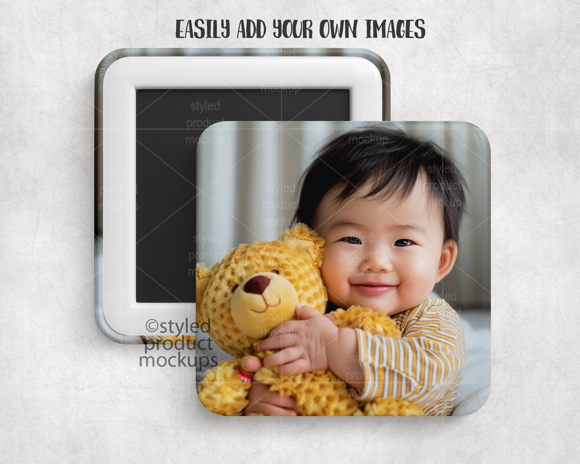 This listing is a mock-up that features the front and back of a square magnet back button. Give a professional touch to your button designs without the hassle of photographing each one. This styled product mockups template is ready to use, simply add in your own art files and background.