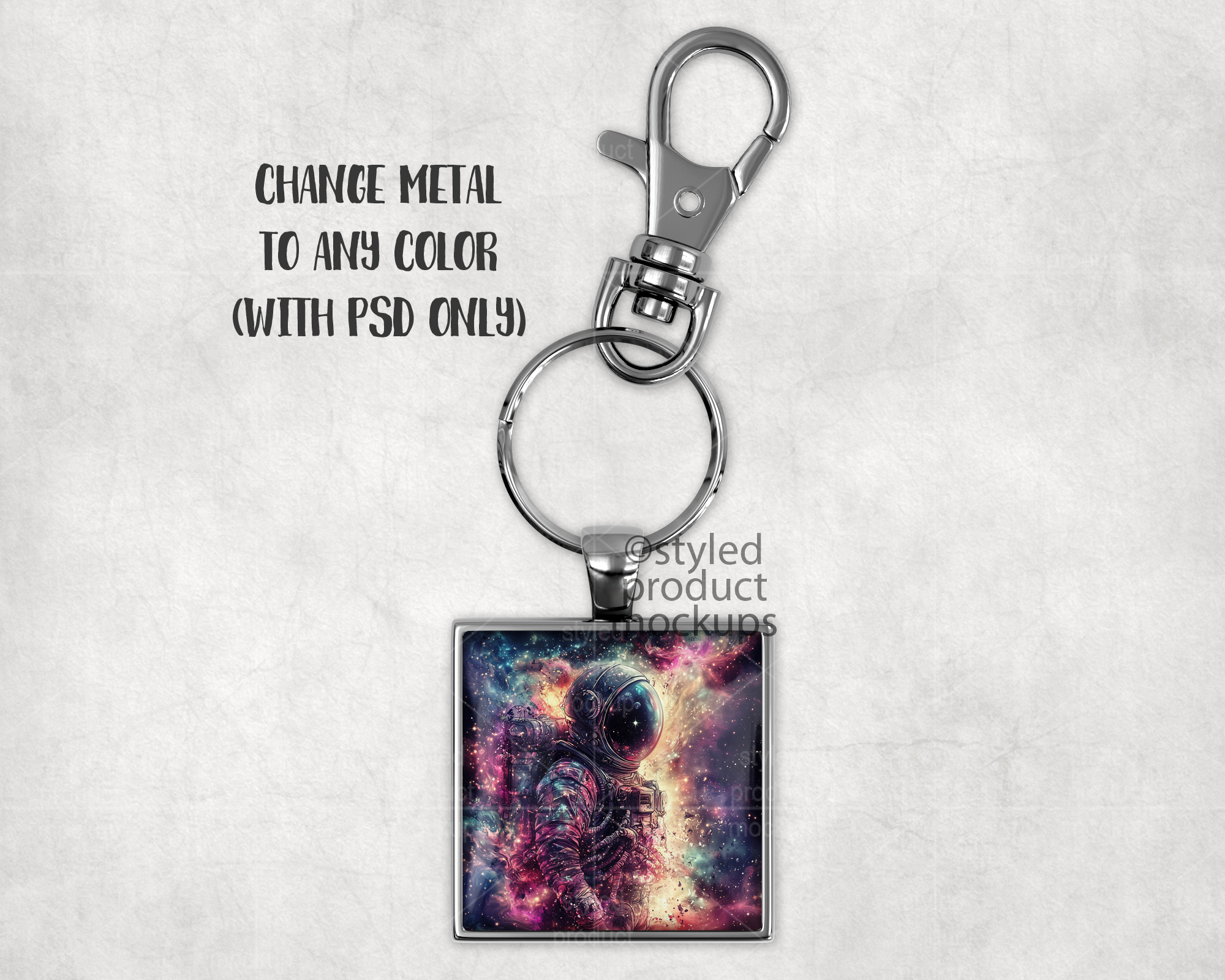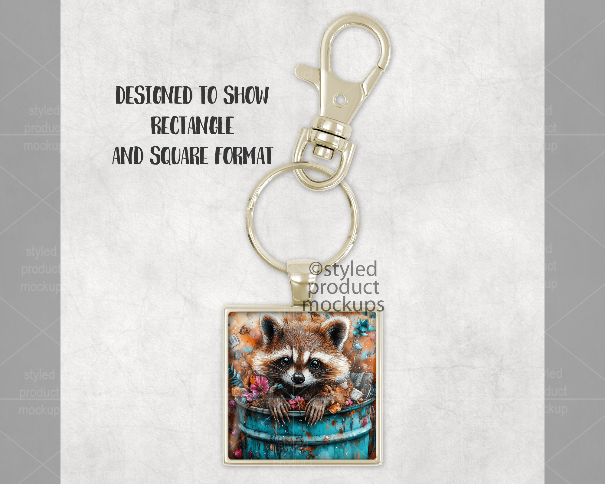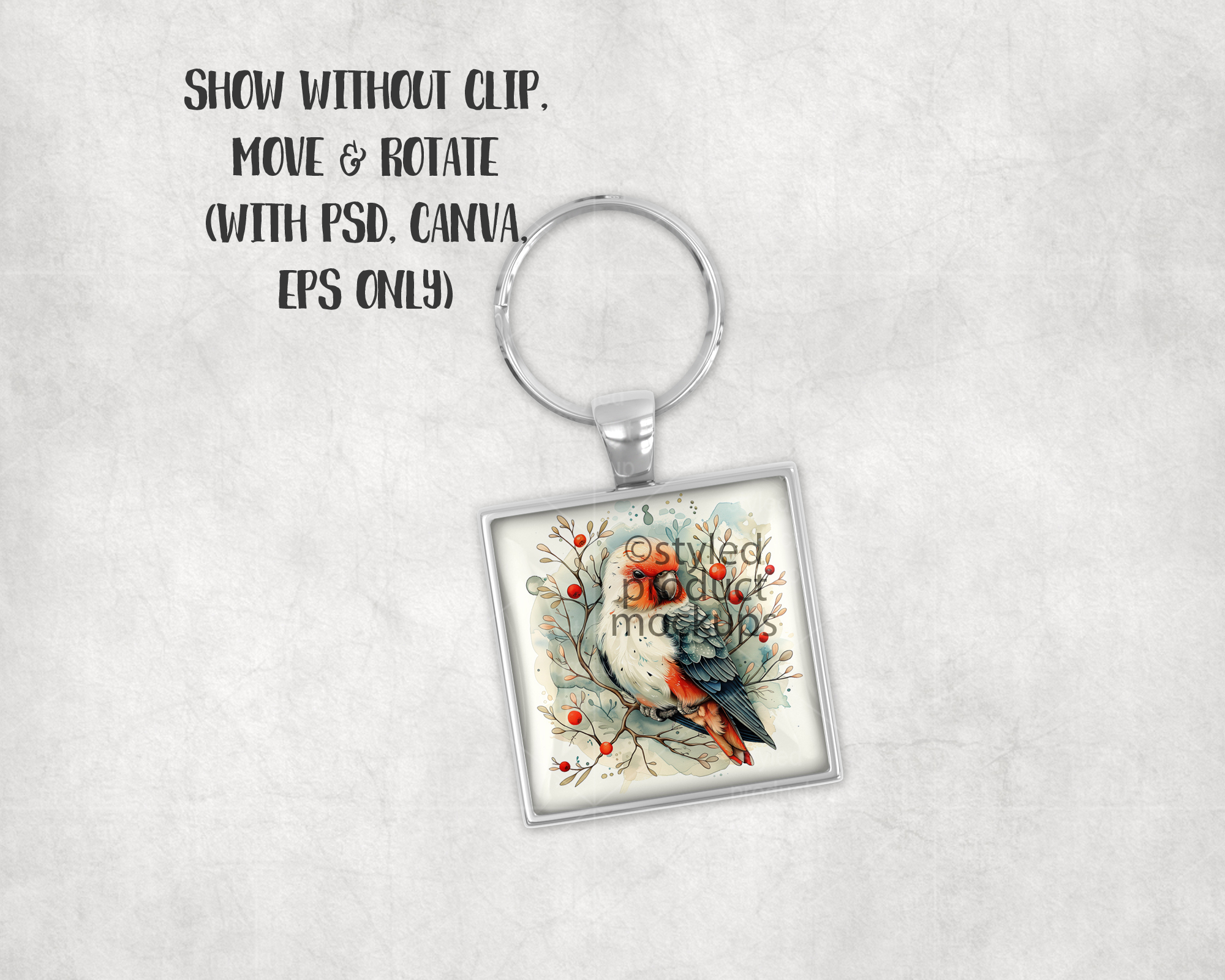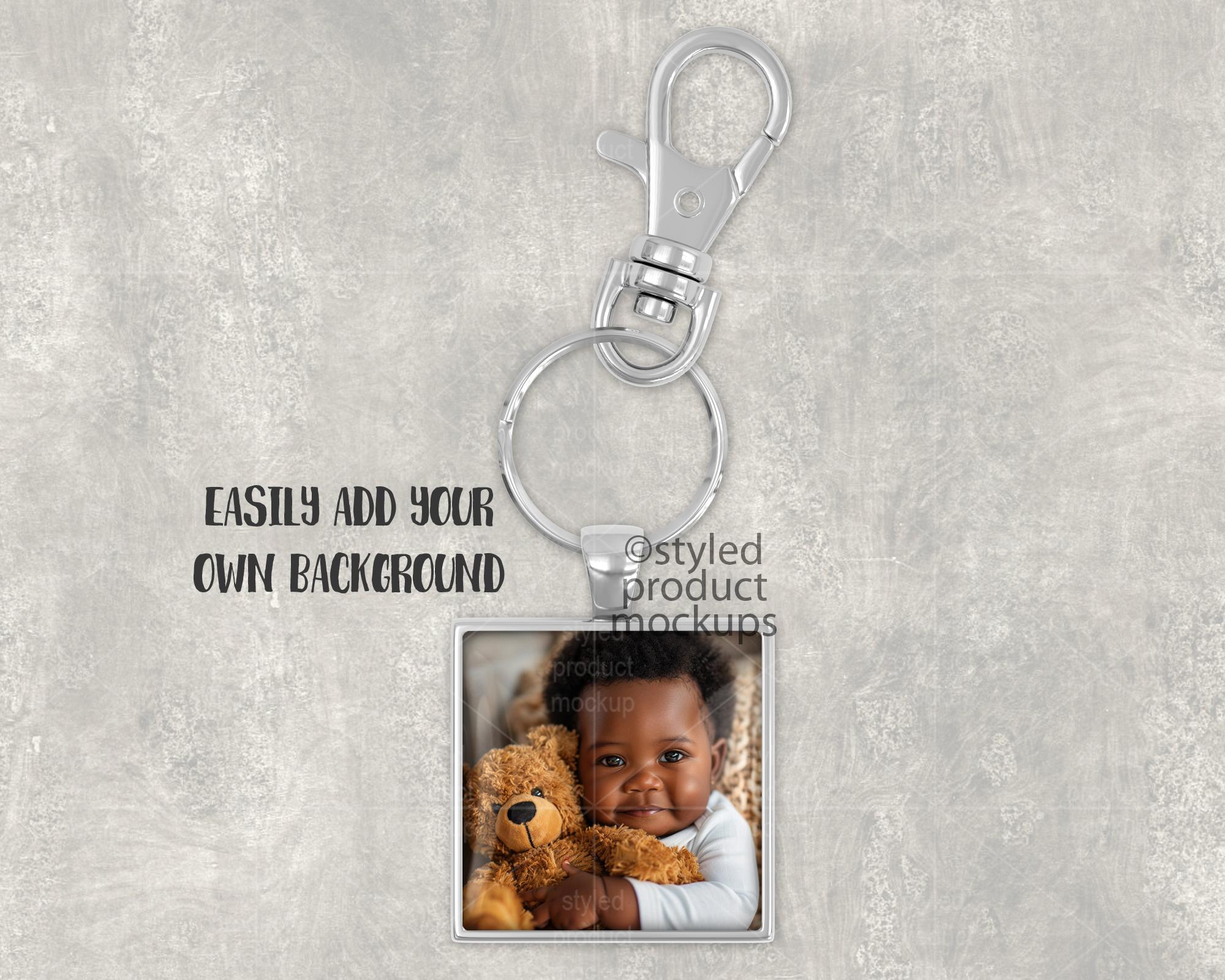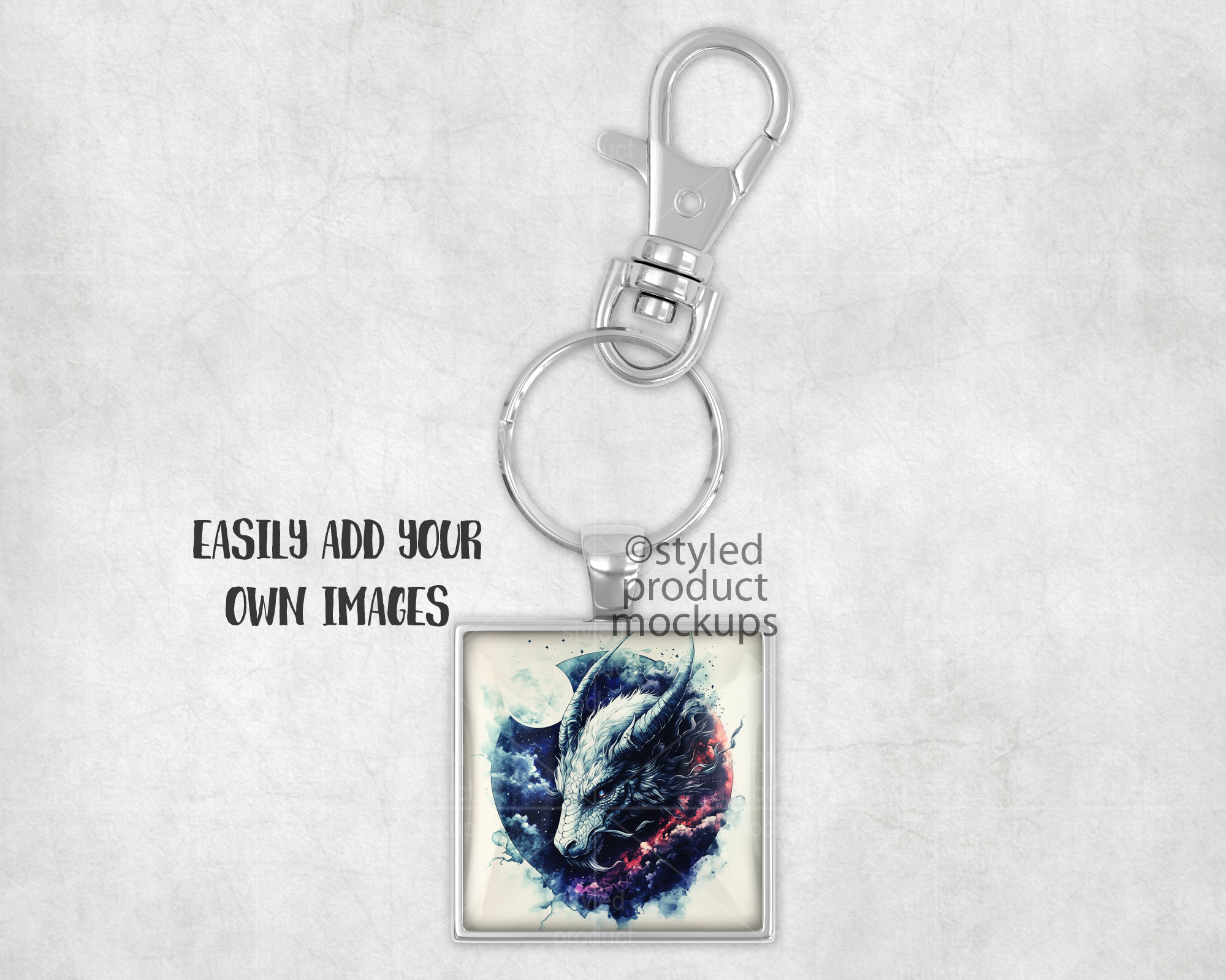 Square Tray Keychain Mockup with glass cabochon, split ring and alligator clip | Add your own image and background