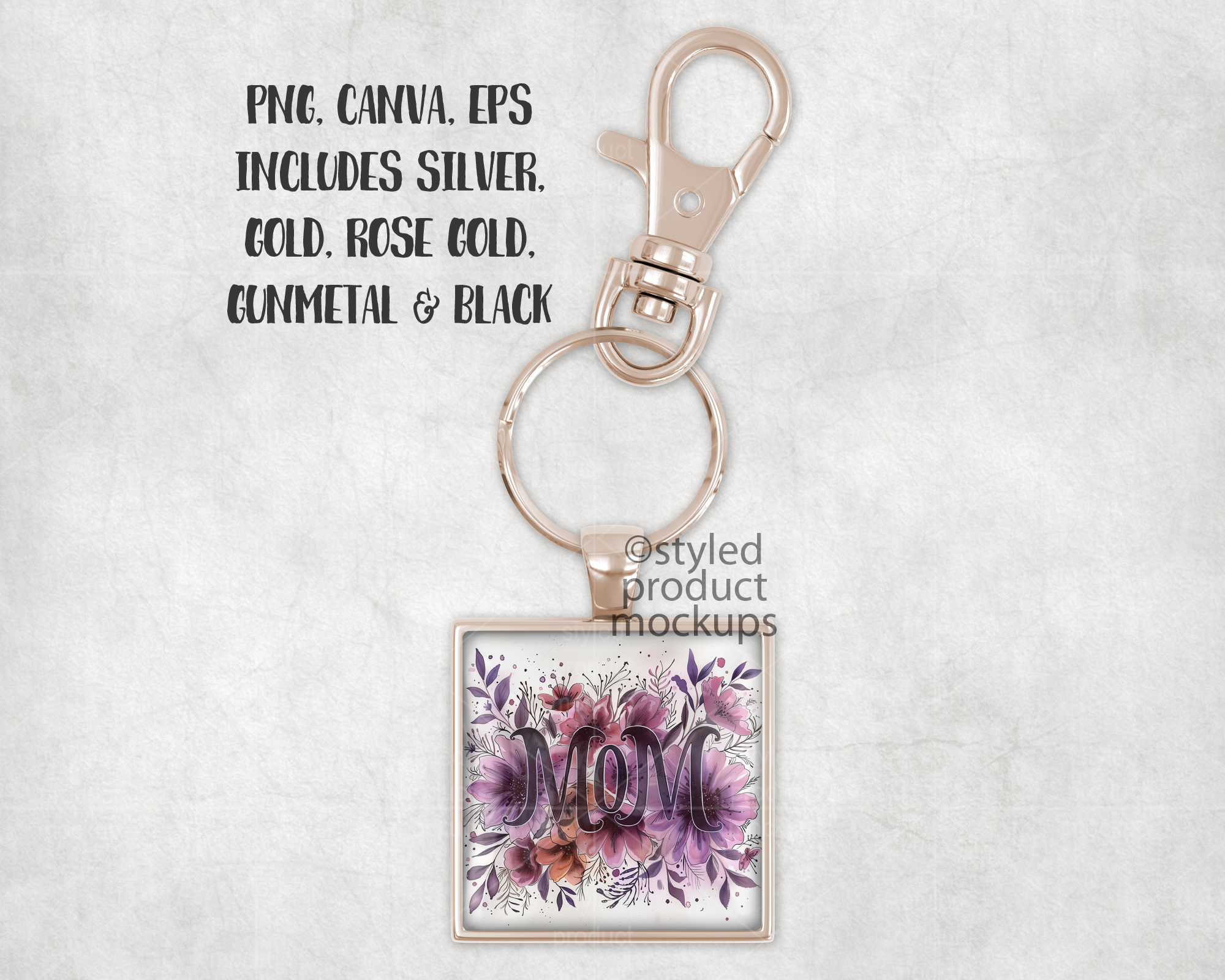 This listing is a mock-up that features a square tray keychain. Give a professional touch to your keyring designs without the hassle of photographing each one. This styled product mockups template is ready to use, simply add in your own art files and background.