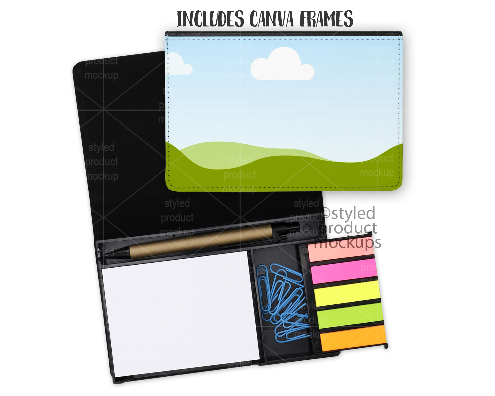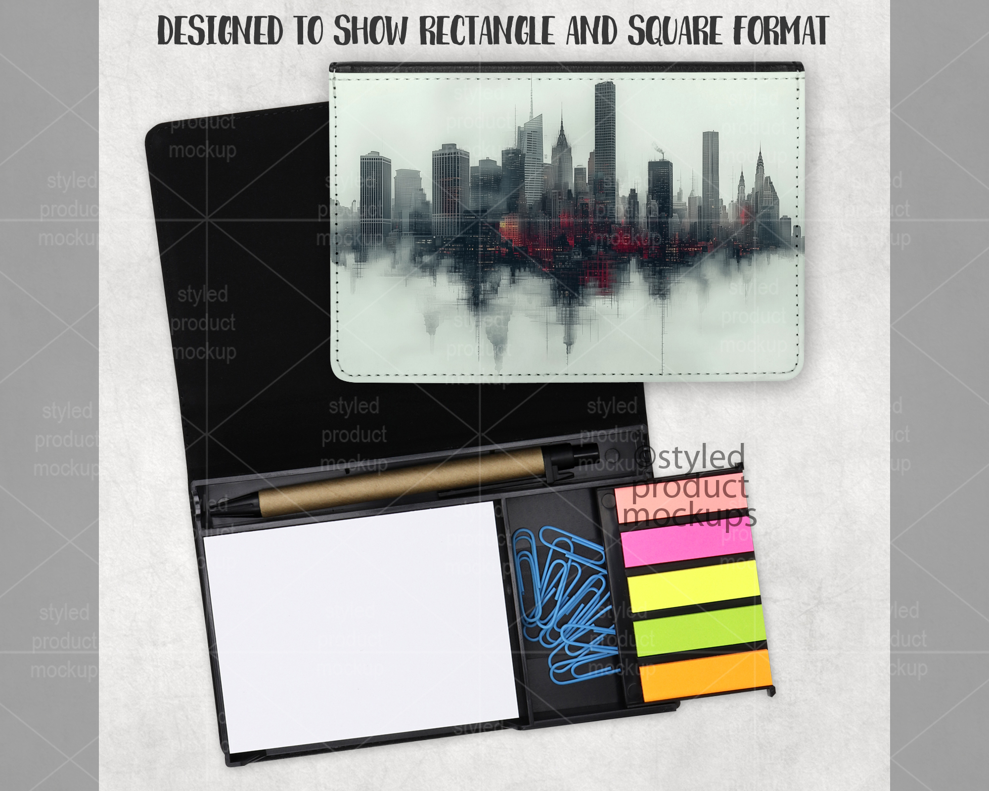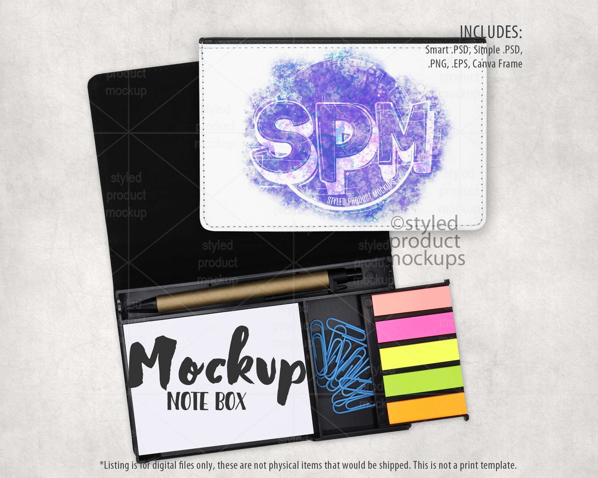 This listing is a mock-up that features a dye sublimation leather sticky note box. Give a professional touch to your notepad holder designs without the hassle of photographing each one. This styled product mockups template is ready to use, simply add in your own art files and background.