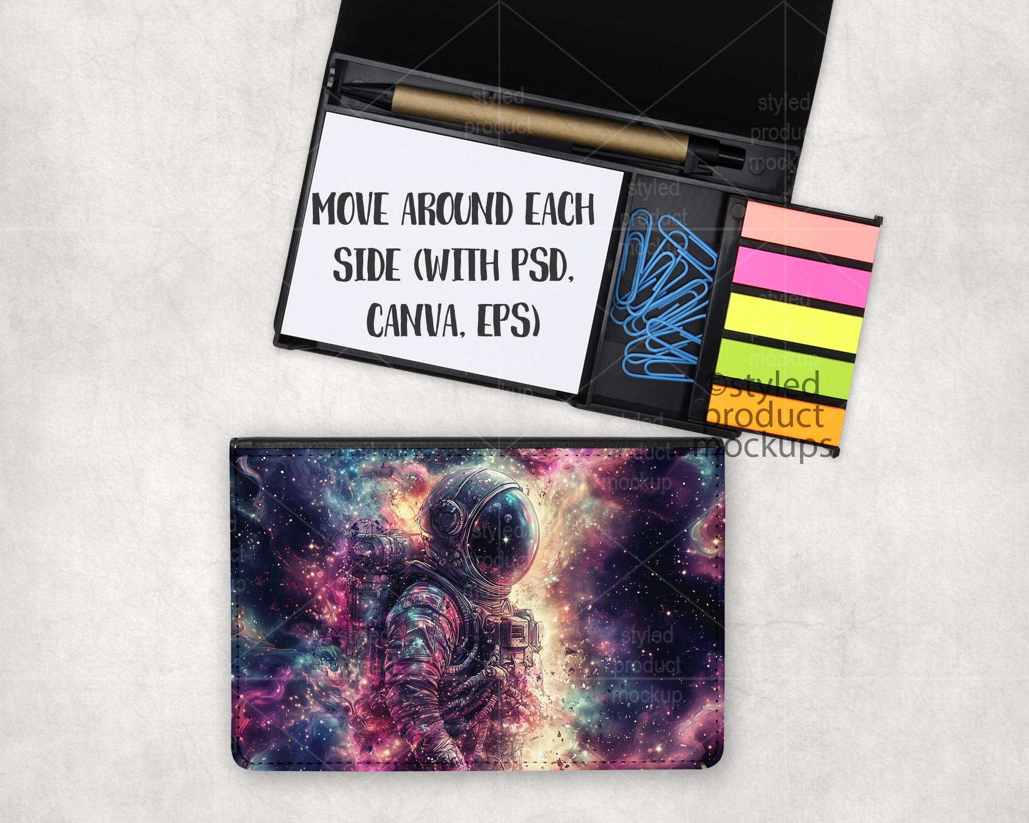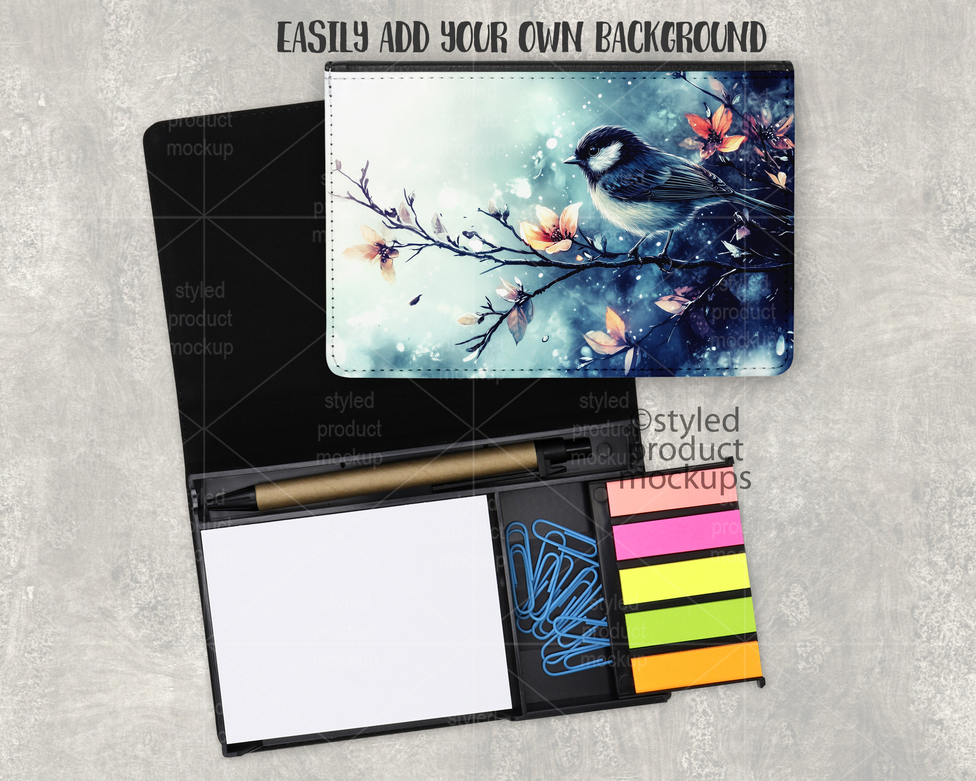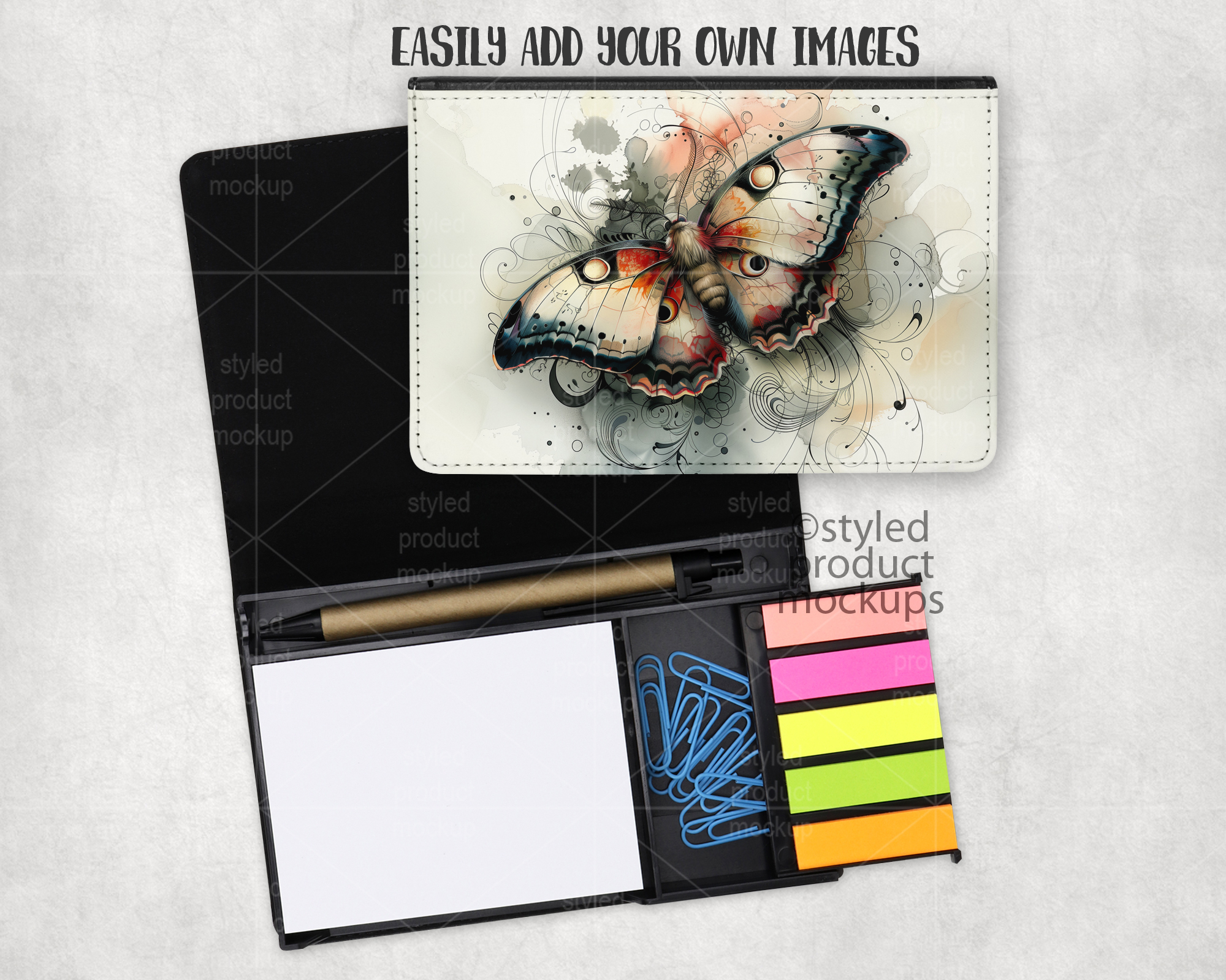 This listing is a mock-up that features a dye sublimation leather sticky note box. Give a professional touch to your notepad holder designs without the hassle of photographing each one. This styled product mockups template is ready to use, simply add in your own art files and background.