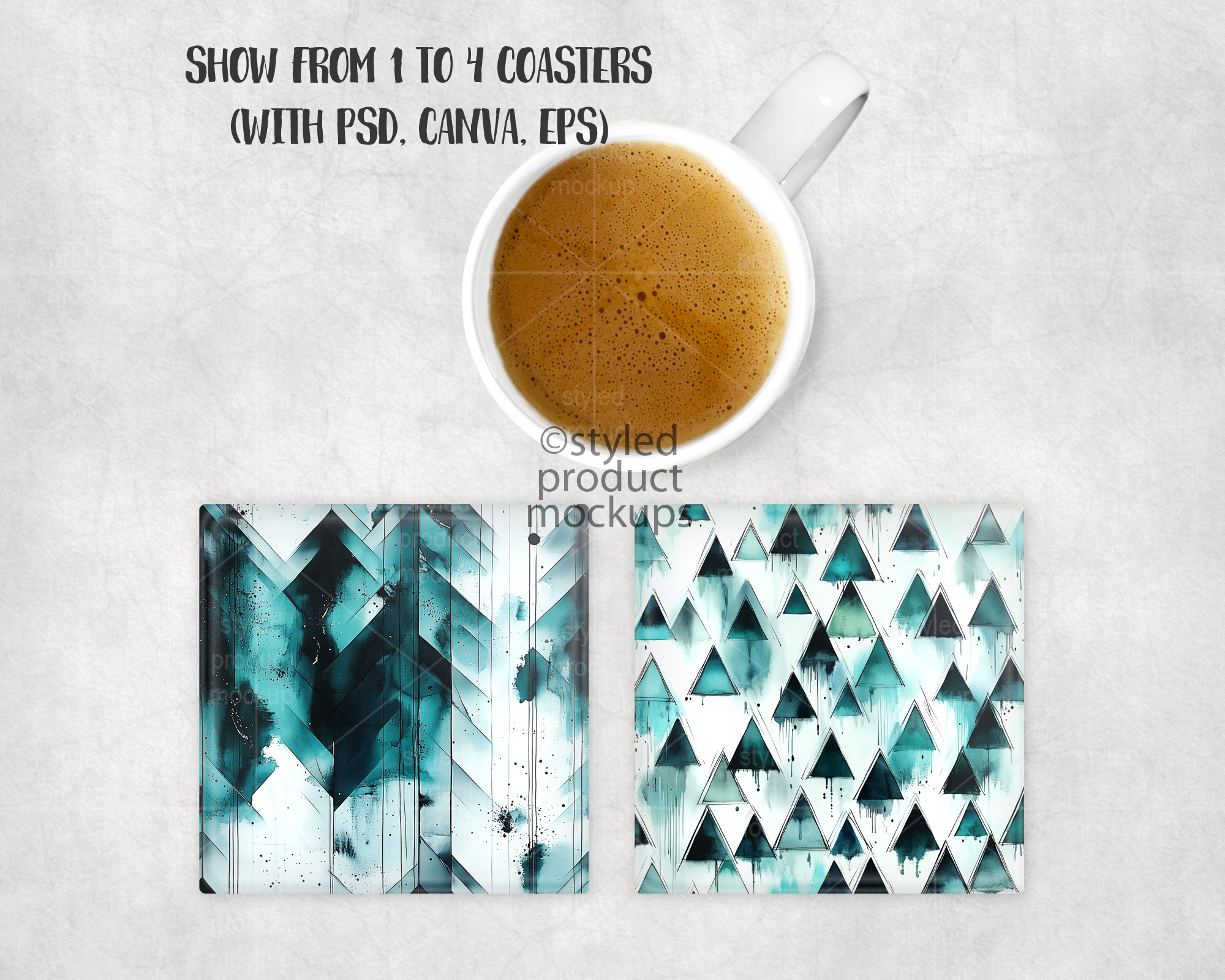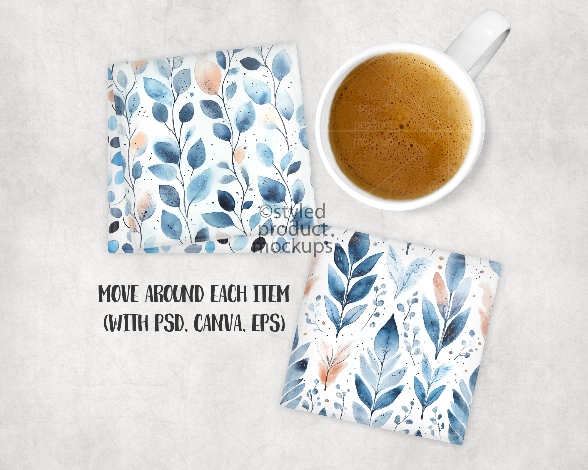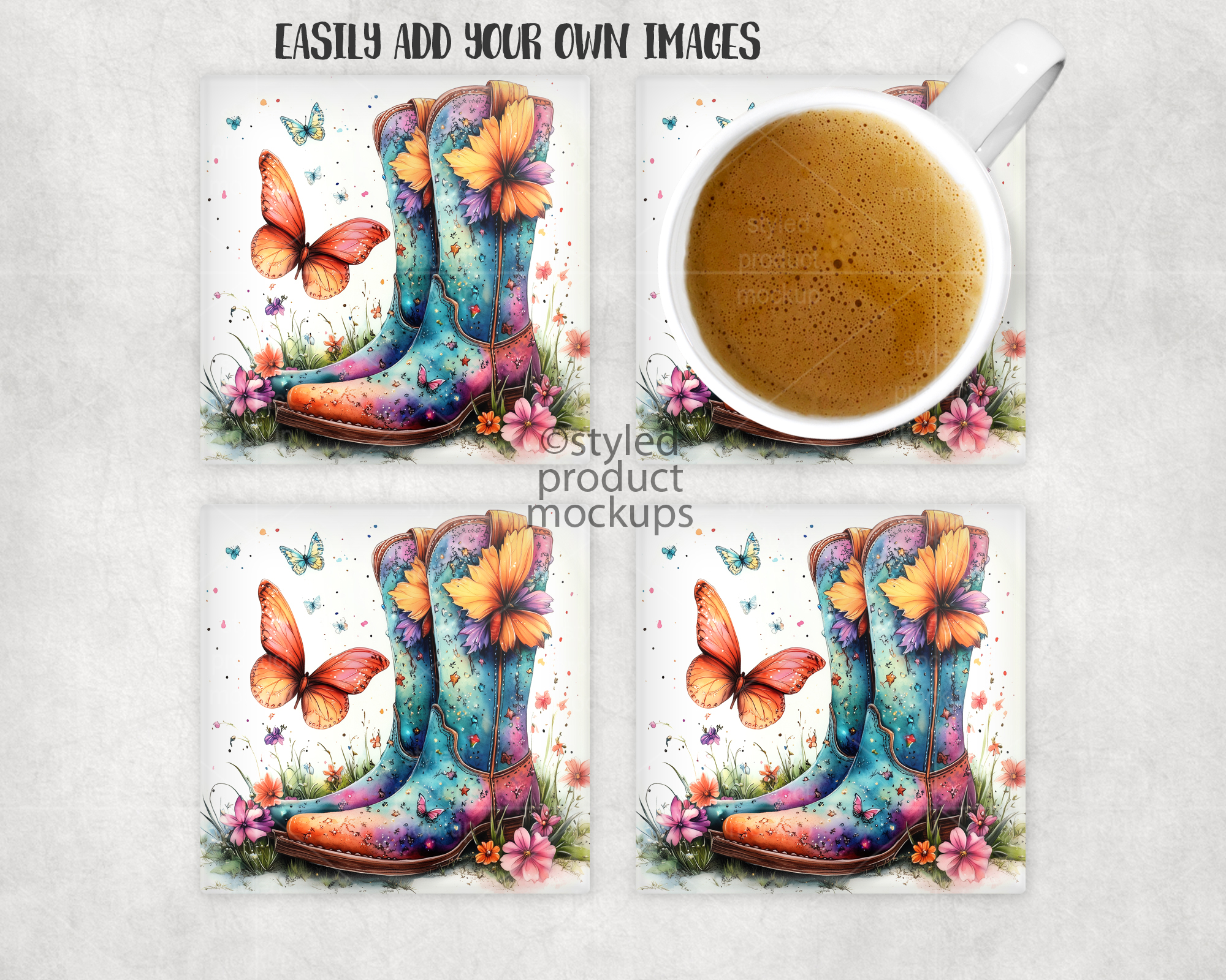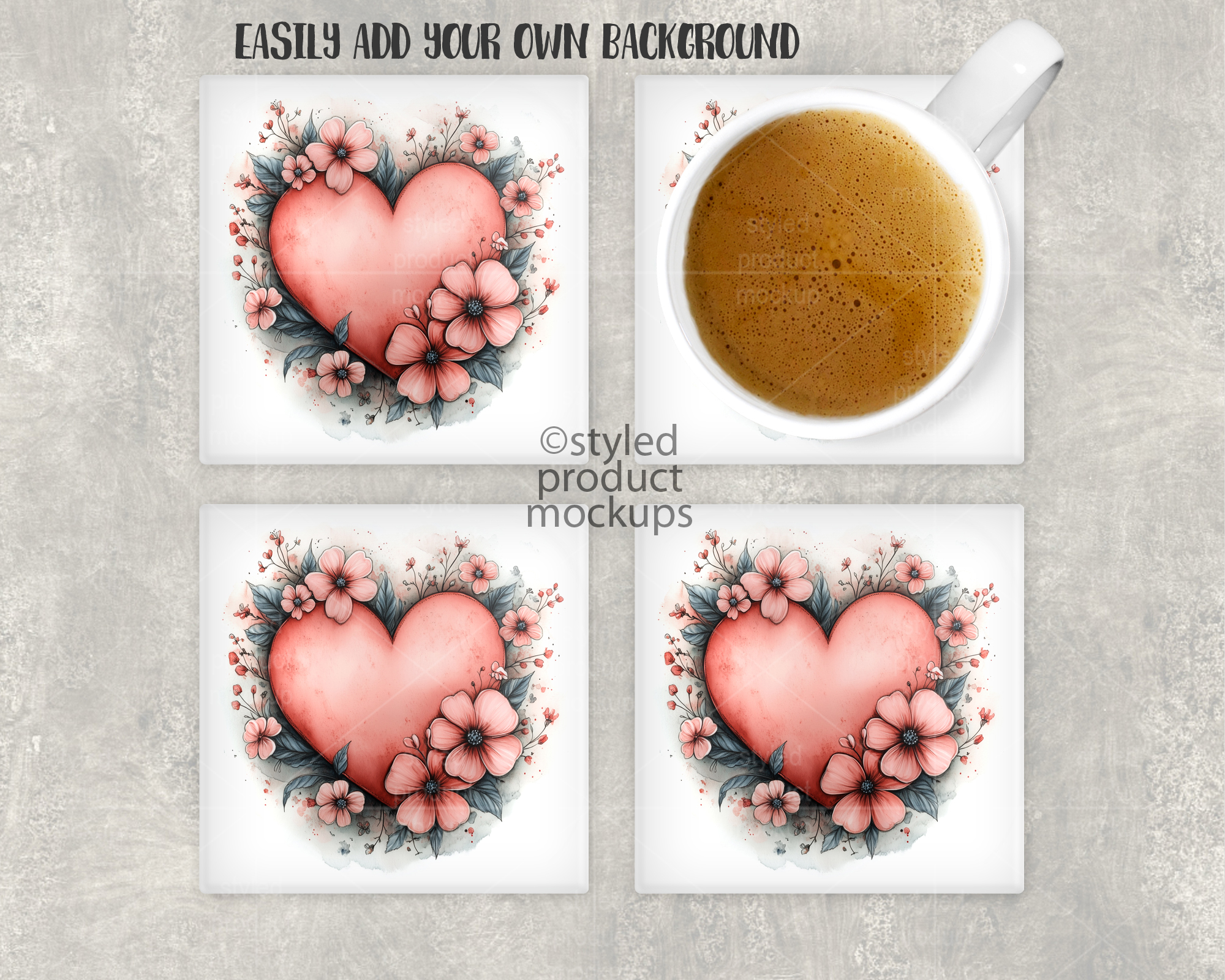 This listing is a mock-up that features a set of dye sublimation square glass coasters. Give a professional touch to your coaster designs without the hassle of photographing each one. This styled product mockups template is ready to use, simply add in your own art files and background.