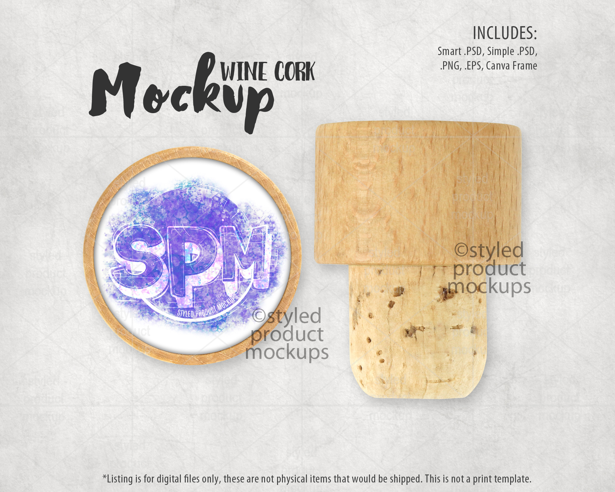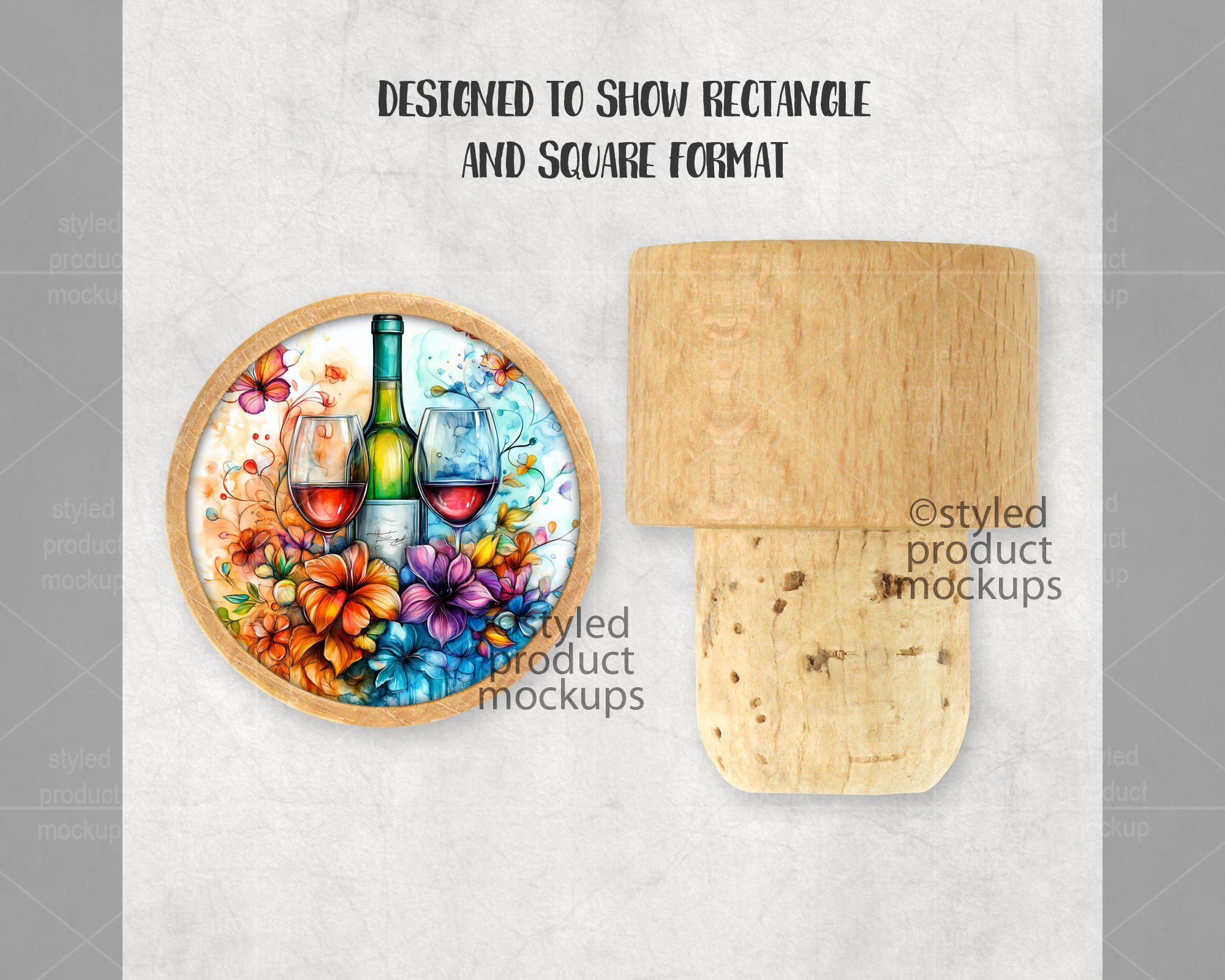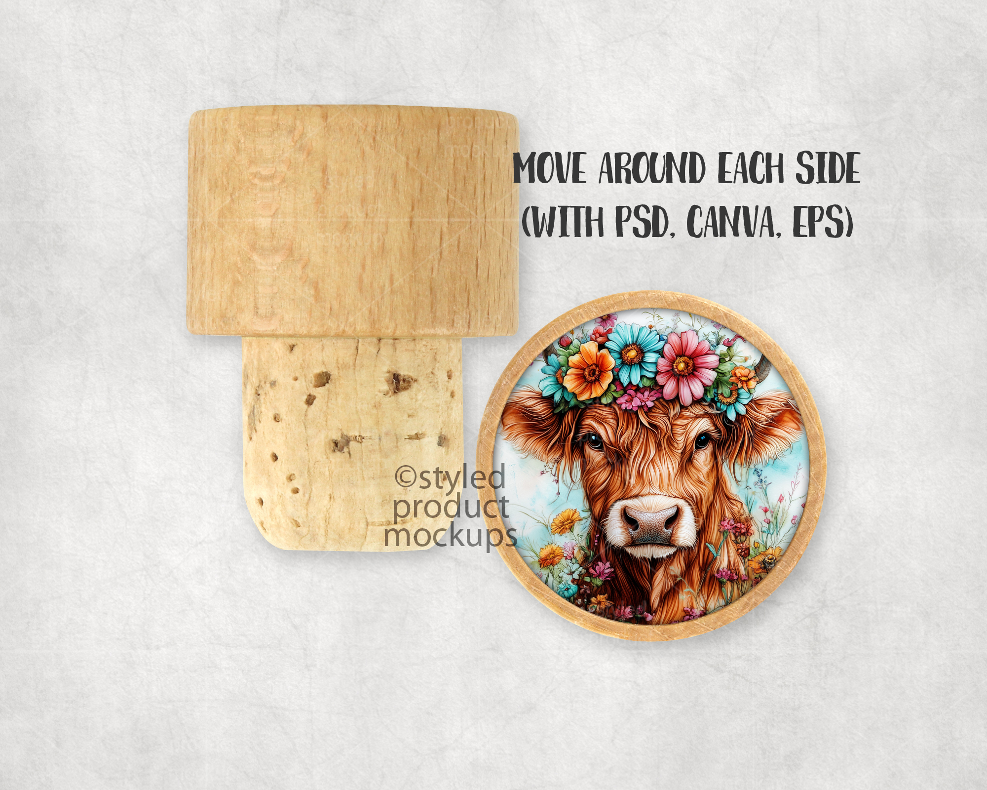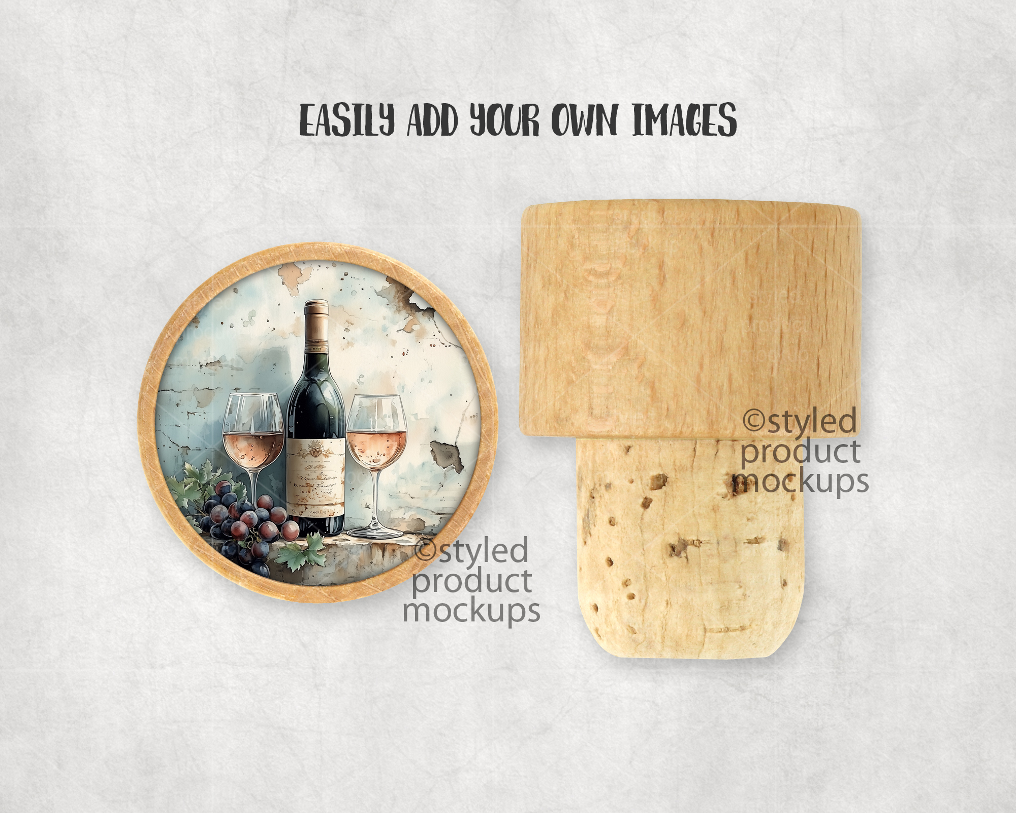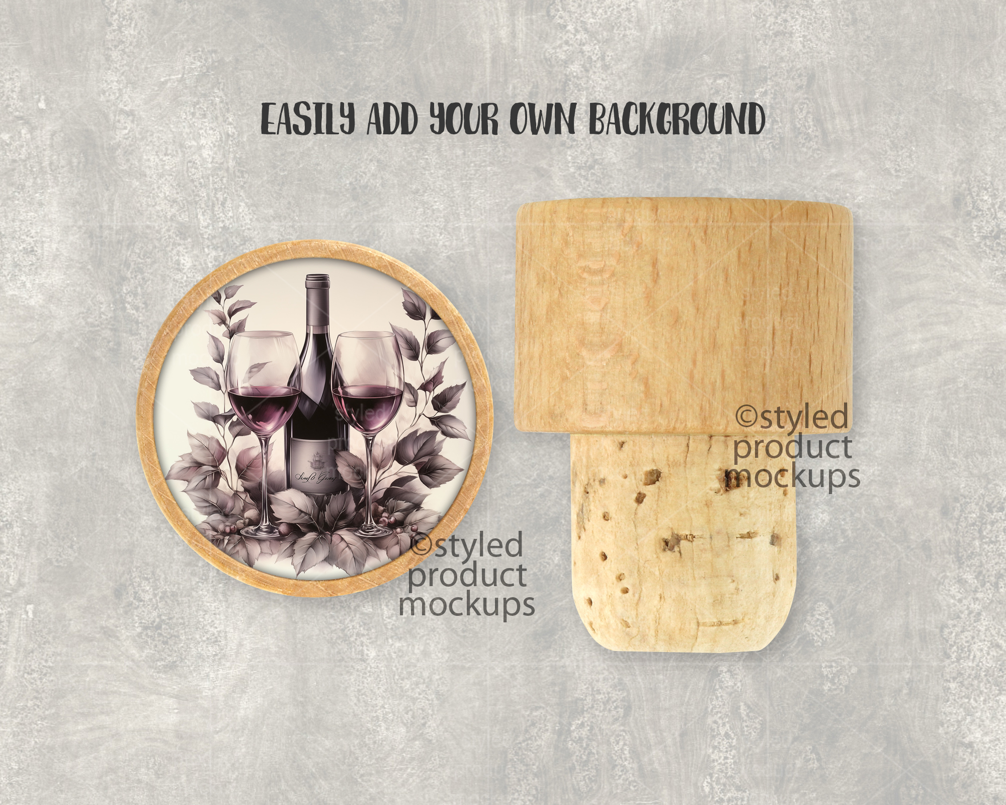 This listing is a mock-up that features a dye sublimation wooden wine cork. Give a professional touch to your wine stopper designs without the hassle of photographing each one. This styled product mockups template is ready to use, simply add in your own art files and background.