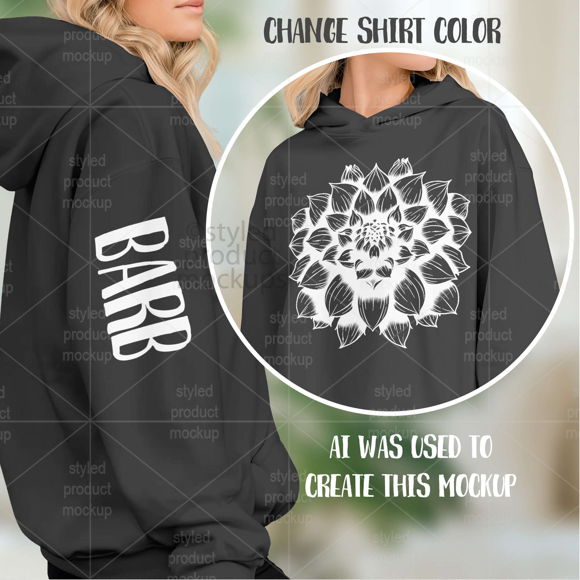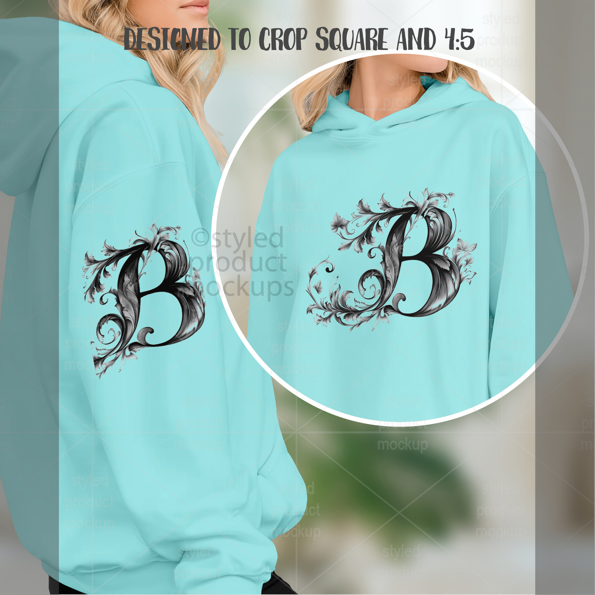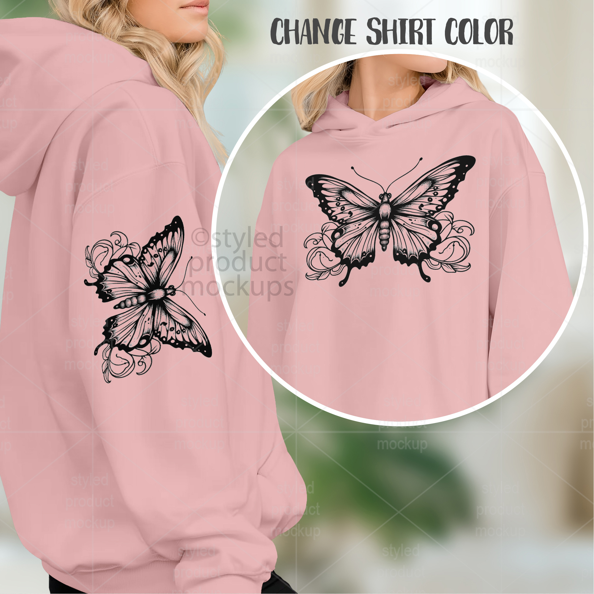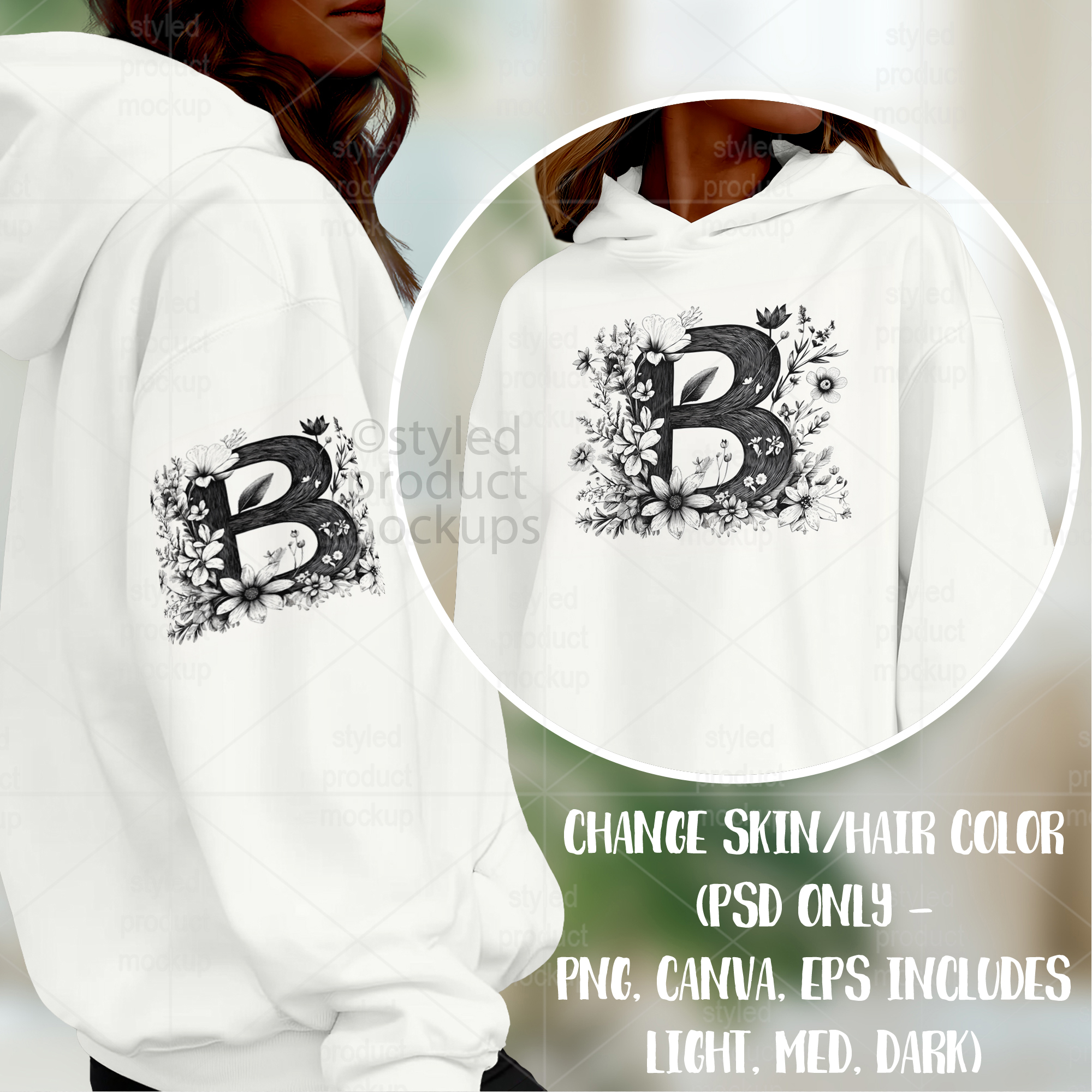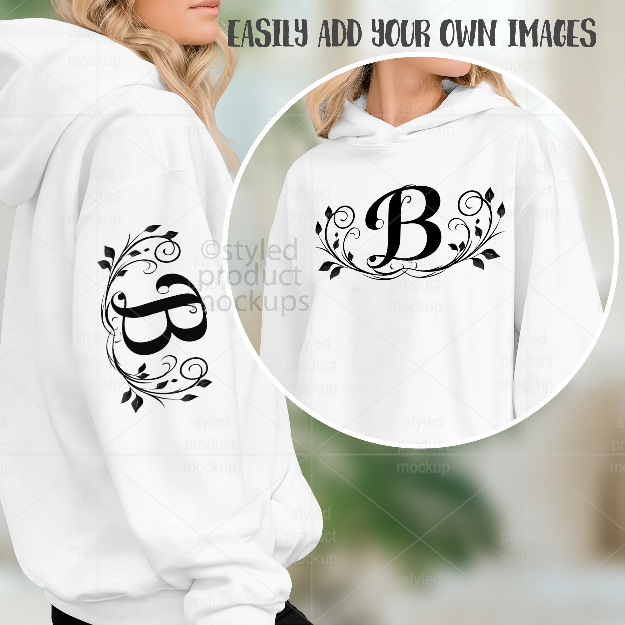 This listing features a front and sleeve view of a sweatshirt on model mockup. Give a professional touch to your sweatshirt designs without the hassle of photographing each one. This styled product mockups template is ready to use, simply add in your own art files and background.