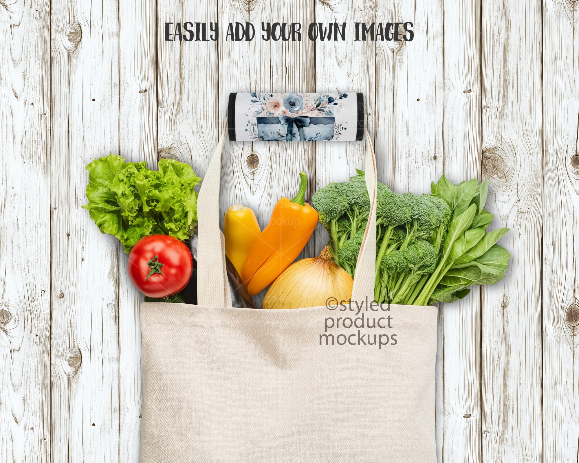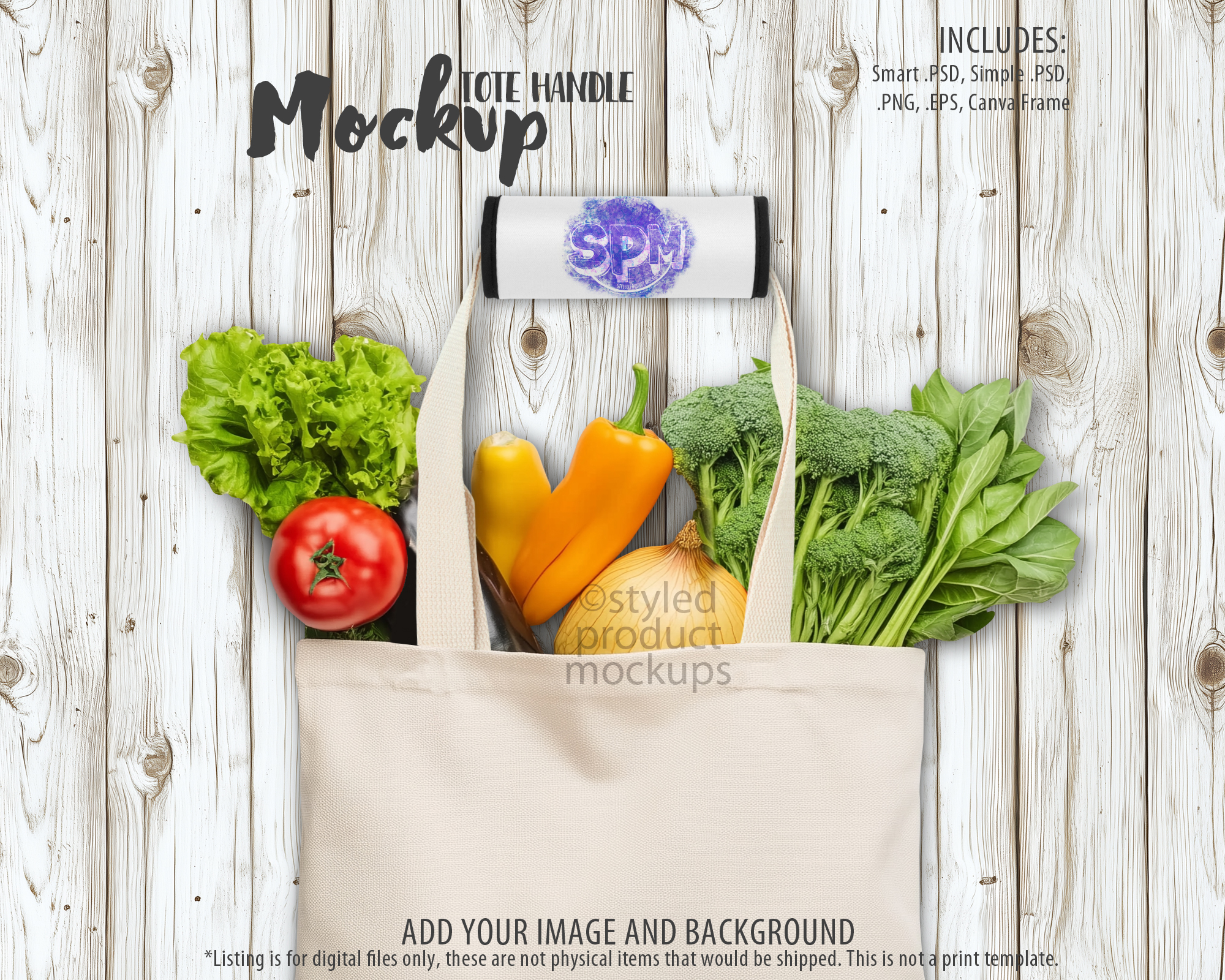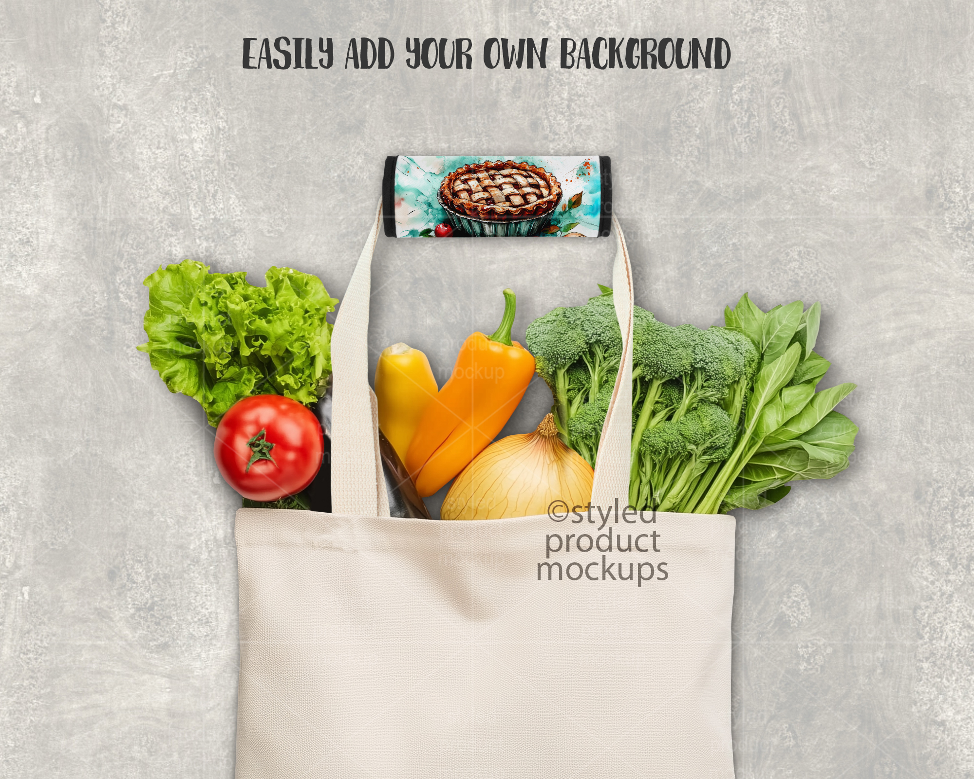 This listing is a mock-up that features a dye sublimation tote bag handle wrap shown on a bag with groceries. Give a professional touch to your tote handle wrap designs without the hassle of photographing each one. This styled product mockups template is ready to use, simply add in your own art files and background.