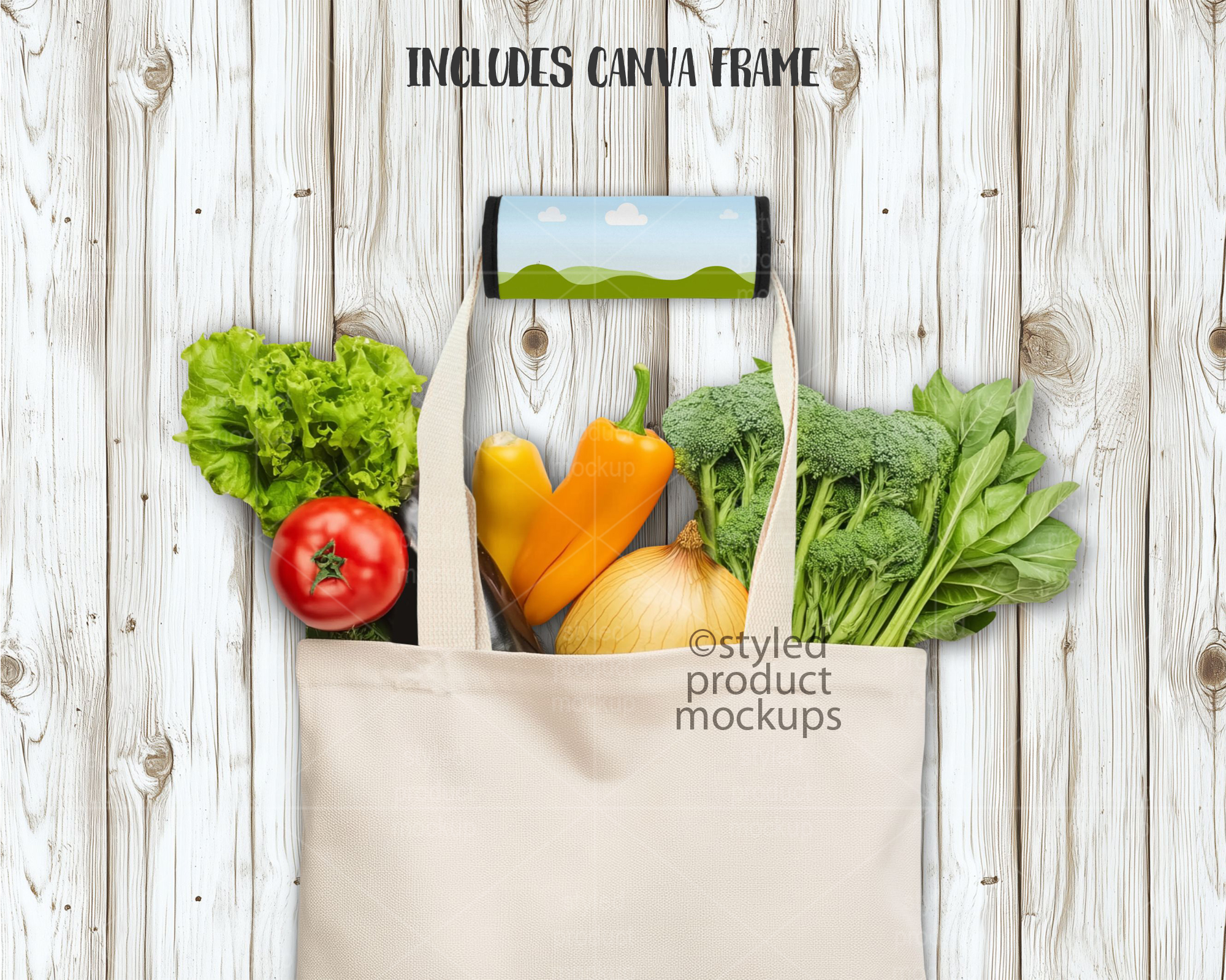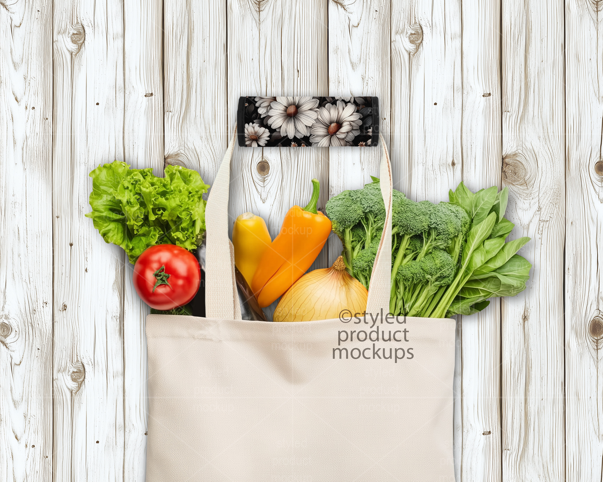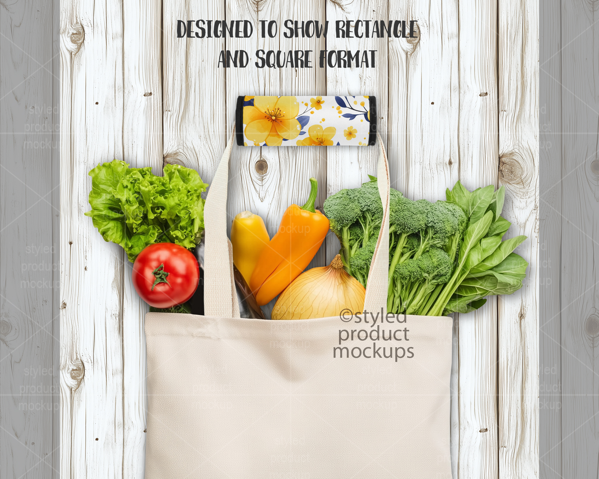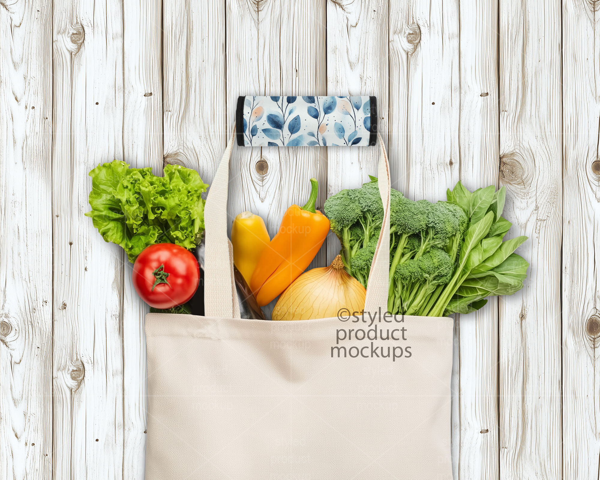 This listing is a mock-up that features a dye sublimation tote bag handle wrap shown on a bag with groceries. Give a professional touch to your tote handle wrap designs without the hassle of photographing each one. This styled product mockups template is ready to use, simply add in your own art files and background.